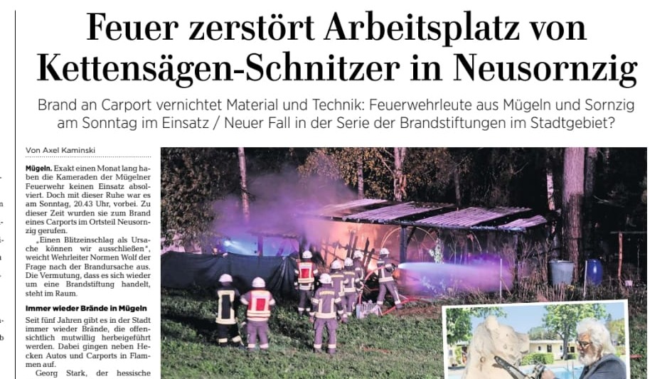 Der große Carport, wo er regelmäßig Kettensägenschnitzkurse hielt, Kettensägen, Motorsägen und andere Geräte, sowie einiges ringsherum wurden komplett zerstört. (ua ein Kleinkipper und ein Häcksler)