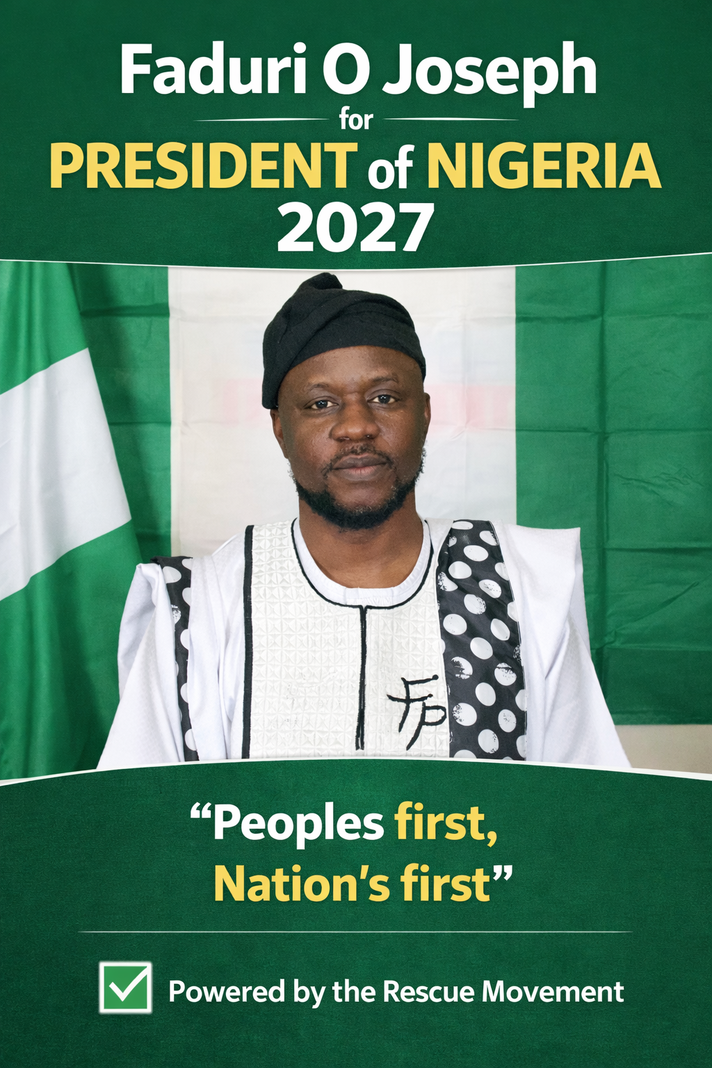 My name is Oluwadare Joseph Faduri, popularly called Fadojoe, and I am running for President of Nigeria in the 2027 general elections. My mission is to change Nigeria and Africa for the better by tackling long time corruption, fixing our broken , medical, economic and educational systems, and restoring Nigeria as a true giant in Africa. I believe that with the right leadership and the support of people like you, we can create a future where every Nigerian has the opportunity to thrive.