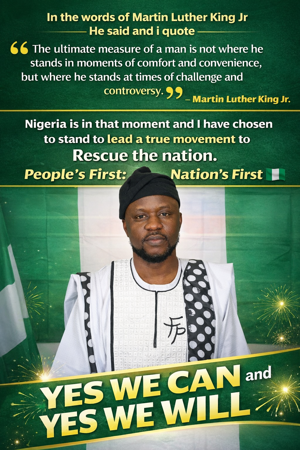Your support will help me bring real change to Nigeria and Africa. Every contribution, no matter the size, brings us closer to a brighter future. Nigeria is a nation that has everything, yet lacks everything. It is time to change the story. YES WE CAN and YES WE WILL.