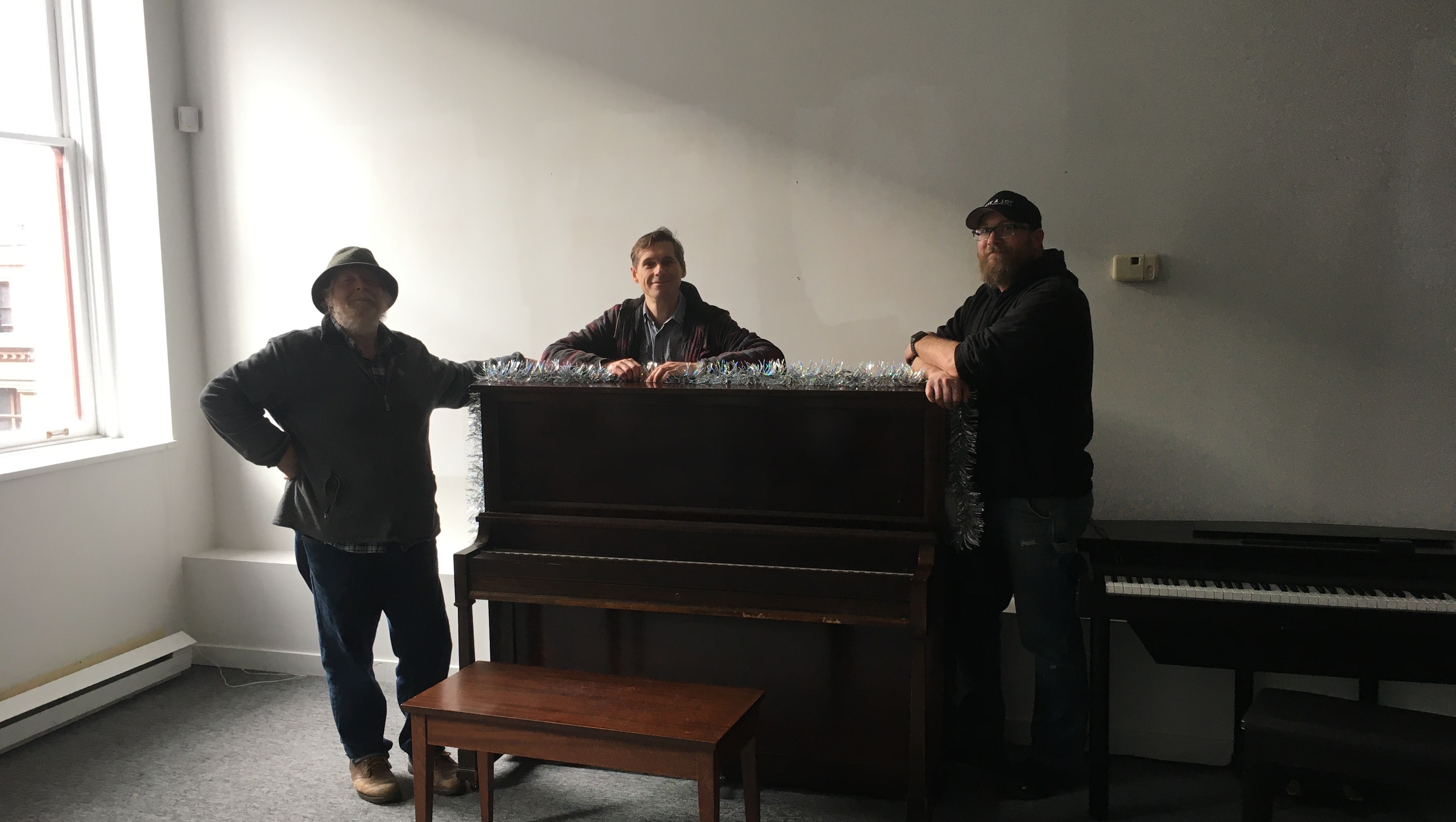 Right now the space already has an upright piano, a digital piano, 10 folding chairs, a small folding table, and a whiteboard. Below you can see a beautiful Willis piano that the wonderful gentlemen in the picture helped me move a couple of days ago.