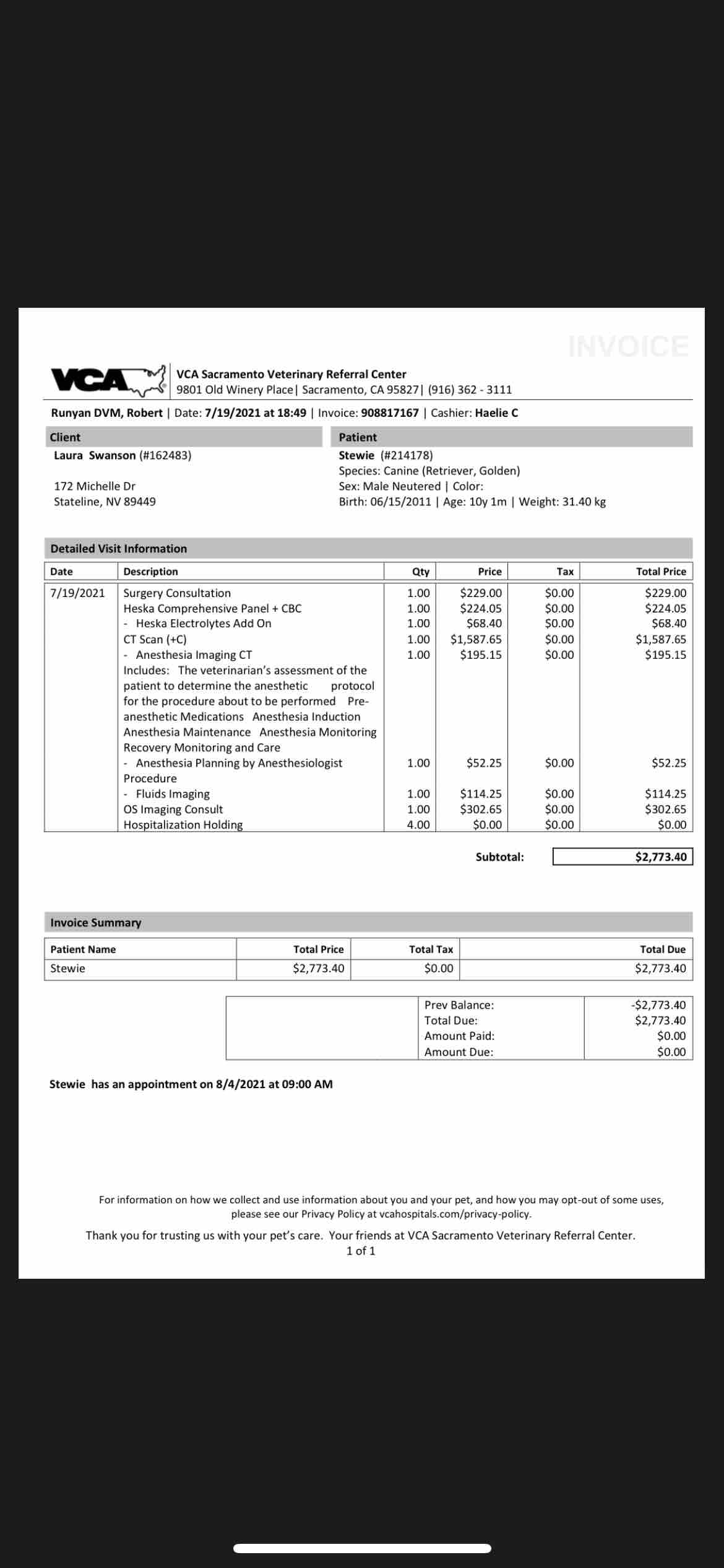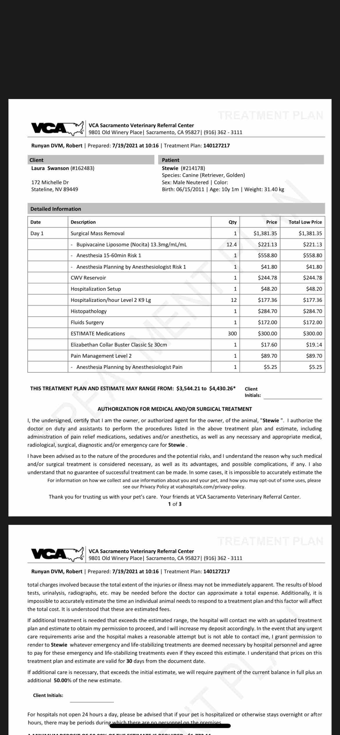 So here we are, just seven months later. The CT scan revealed three large lipomas on his chest, two that are joined in the brachial plexus, and one in front held within muscle tissue. The good news is that they’re on the outside, and I have gone with the well-equipped VCA in Sacramento, and a fast, board certified surgeon who specializes in this and who seems very confident that he can get all of it out without damaging the nerves. The recovery will be a long one no doubt, but the hope is that Stew will bounce back quickly and in better shape than before. Third time’s a charm right?