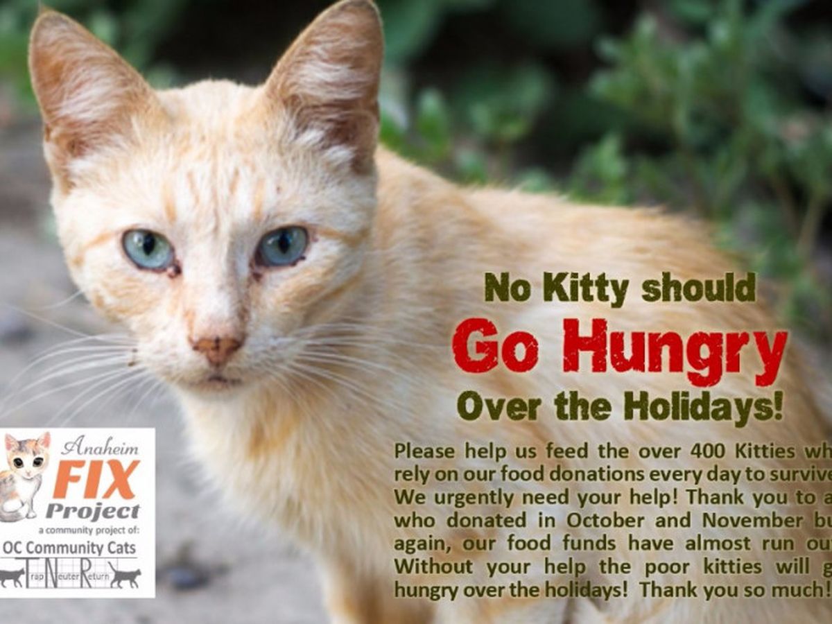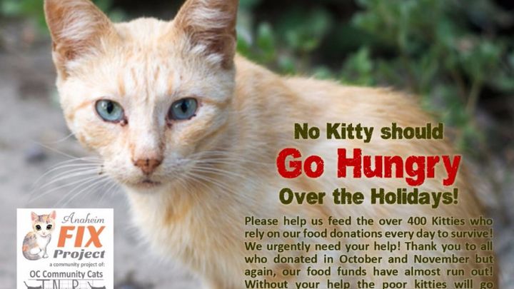 Over 400 stray and abandoned Kitties need your help this cold winter so they can be fed and so the kitties who are sick or injured can recieive medical help! These homeless and abandoned little angels depend on the all-volunteer, non-profit group, Anaheim Fix Project/OC Community Cats for their food and vet care every day! Thank you to you generous souls who have donated before, but sadly funds have again run dangerously low because food costs are approx. $3,000 per month plus spay/neuter (TNR) costs and there are often emergency vet bills to help sick and injured kitties. No kitty should be left on the street, cold, hungry and sick or injured! We can't keep the kitties fed and cared for through the tough winter without your holiday help!