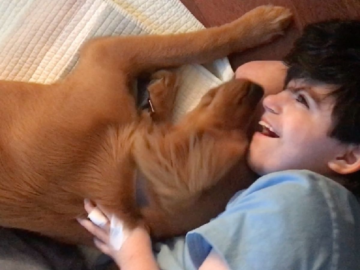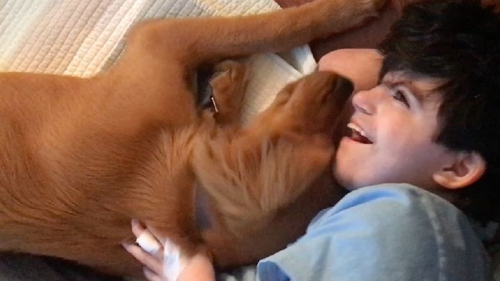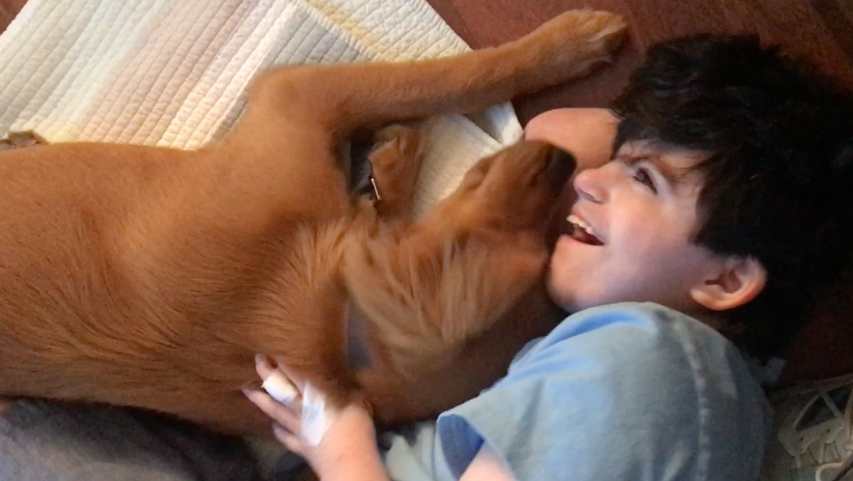Last year when Felix was 14, his parents got him his first dog, Zelda, a golden retriever puppy. His family hoped to make her a companion dog or seizure alert dog. Zelda has a long way to go in training because of her excessive positive exuberance, but she’s already made a huge difference in the lives of Felix and his family. Zelda makes Felix smile and laugh. She’s still young and full of energy, but she has always been extra gentle and sweet with Felix – even though she tackles every other human she’s ever met as if they are friends returning from a very long journey. She has learned how to retrieve toys that Felix loses under his hospital bed, and she warns Felix’s parents when he knocks over his IV pole or his feeding machine beeps with errors at night. One of her jobs is bringing in the mail from the mailbox each day, which she does with gusto and flourish.