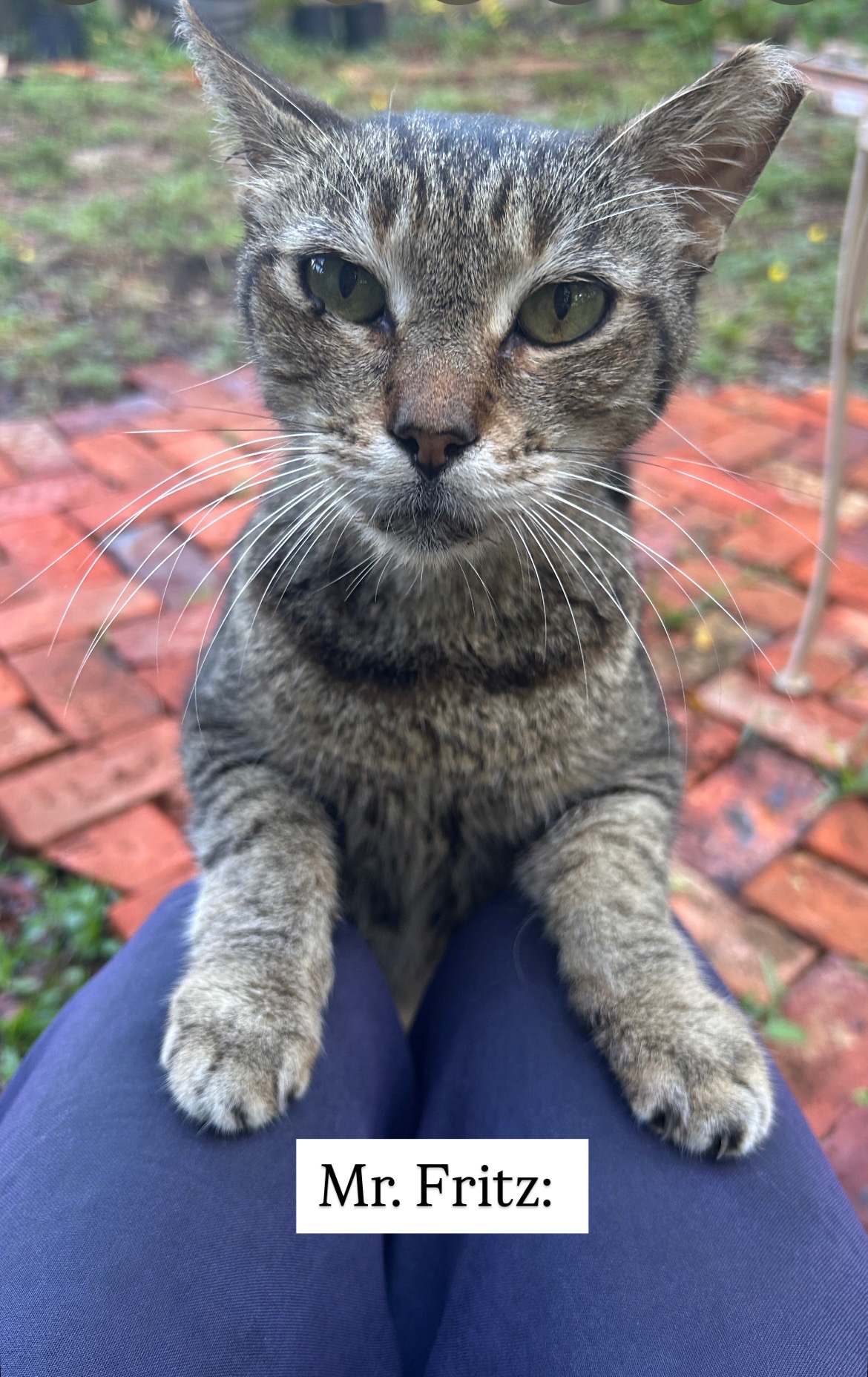 Sadly, Mr. Fritz silently lives in excruciating pain, either from stomatitis or an abscessed tooth. He waits till all of the others have eaten, then he creeps around eating what’s leftover because he doesn’t want the others to see him jumping back in pain. He tries to eat but barely can- he’s losing weight due to his mouth issue. He needs medical care immediately (antibiotics, possible tooth extraction) so he can eat again and enjoy his golden years.