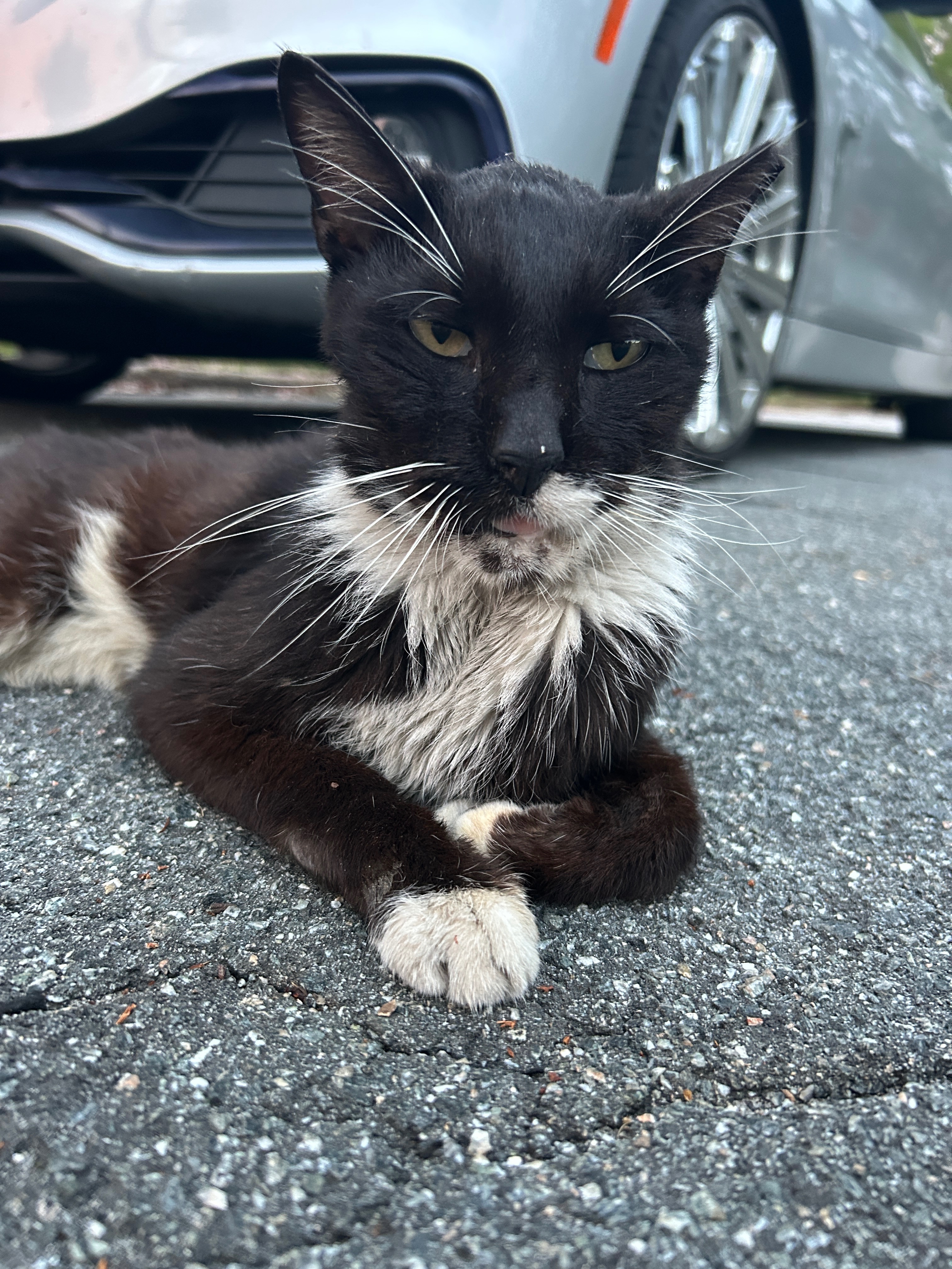 Throughout the horrendous summers and uncomfortable winters they’ve lived crouching underneath cars and have accumulated oil deposits all over their fur. Ms. Pepper lived for about two years completely matted, made worse by smelly drool from her mouth. The Ape Woman finally was allowed to touch her, and she cut, combed and bathed all of her fur so she could live with dignity finally.