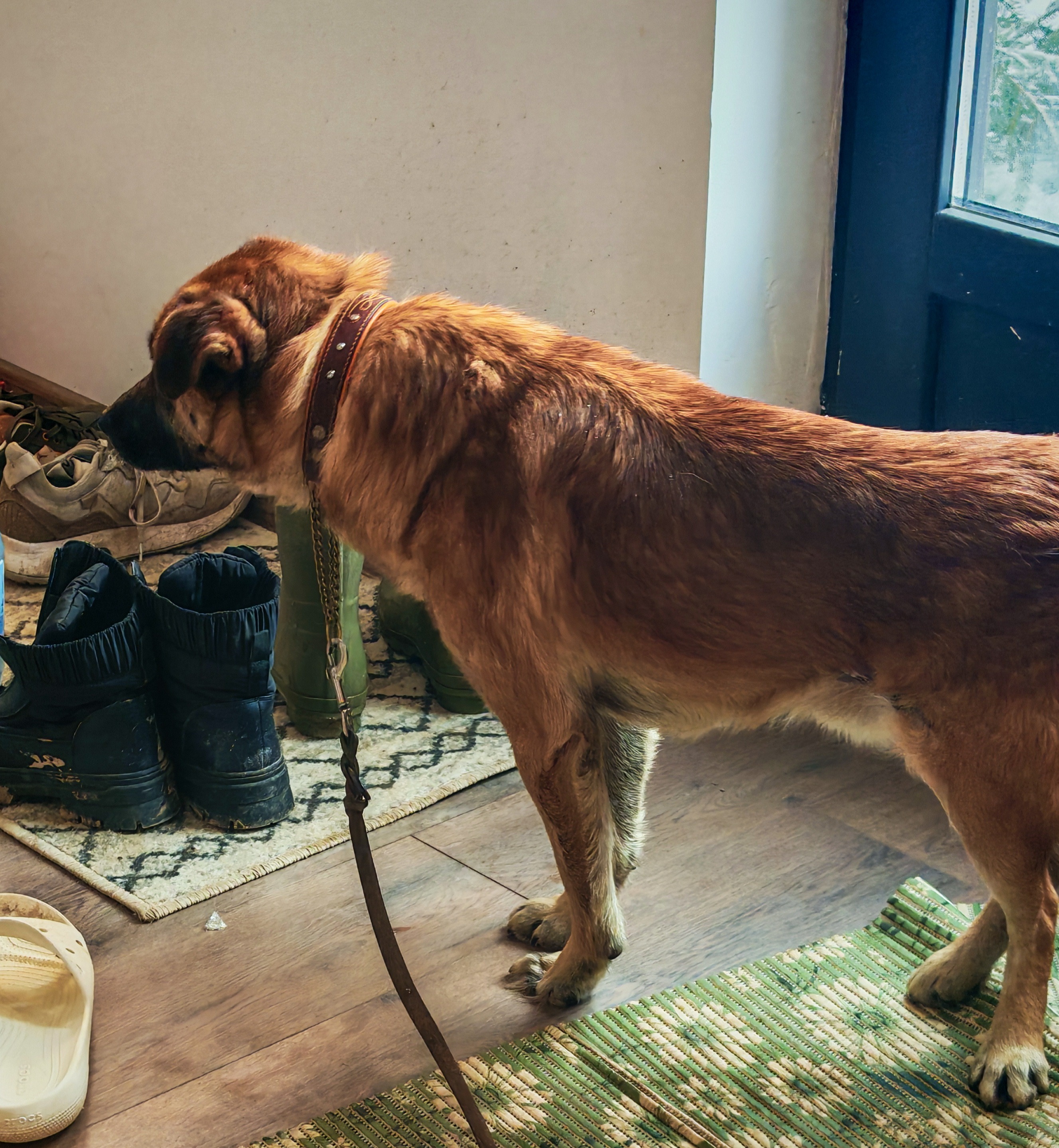 Fergusilla on takajalka poikki ja se on hyppinyt jo kuukausia kolmella jalalla, ja Fergus pääsee leikkaukseen maanantaina. Fergus myös kastroidaan.