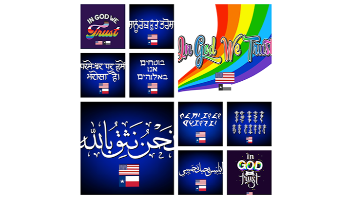 To voice our dissent with Texas SB-797, we're going to design, print, deliver, and donate 500+ "various" languages (Arabic, Hindi, English Gay Pride, Spanish, Vulcan, Klingon, and others) "In God We Trust" 16x20 posters to schools in Texas, flooding the public school system with our IGWT artwork.