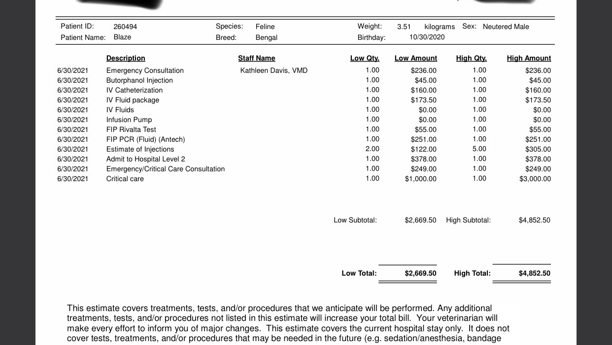 Hi! our names are Rob and Rylee. We are not doing this because we want to, but because we don't have any other option. This treatment is VERY EXPENSIVE, and we simply cannot afford it all on our own. Our pet insurance has denied us, we signed up when we noticed he was acting strange, but this is considered a pre existing condition. Blaze is our world and we will do whatever it takes to save him and or keep him comfortable. He is an 8 month old bengal who used to love playing hide and seek, go on walks and adventures with us. About 2 weeks ago we noticed his health declining. He was sleeping a lot more and we thought maybe he was just going through a growth spurt. Days went by, then a week and we knew something was up. He was not only extremely lethargic, but he wasn't eating as much, i found him sleeping in his litter box. One day, he started meowing at his carrier, letting me know he needed help. We brought him to our local vet last Friday, we did blood work, and were sent home with antibiotics. Saturday we received a call saying he had some sort of infection and we got a new set of antibiotics. Yesterday ( Wednesday 6/30) we rushed him over to the Emergency Vet because he was not eating all day and his eyes looked strange. Blaze had a fever of 104.6. 105 is dangerous for cats. They kept him overnight on IVs. We spoke to them last night before bed, his fever had gone down to 103.1. Today we got the dreaded call. Our baby is suspected to have wet FIP. We dont know a whole lot about about it right now, except that is is VERY expensive, not 100 % curable, but there is hope!! This is such devastating news, but we will not let this expense stop us from helping our baby. He is being seen by critical specialist, which costs $1000 each visit. I will attach a copy of his bill from the first night. We are looking at doubling that if he has to stay again. We have to pay 80% in order to proceed. This is going to be an extremely long, expensive, and painful journey for blaze and us. Treatment for FIP is not FDA approved, so we basically have to get this medication elsewhere. Vets are not allowed to treat for this, or advise what to do. They can only point us to a facebook group, which we have joined and other parents with experience are a support group for us. We have to purchase a ton of supplies such as syringes, the injections itself, antibiotics, anxiety/ nausea tablets, blood work every 30 days, and critical specialist visits. Please, even if you cannot donate, please share and help our baby live a longer healthier life. We are fighting for him and with him, and we ask that you join us in this fight. If you know blaze, you love him. Thank you all in advance and we will give updates as we receive them.