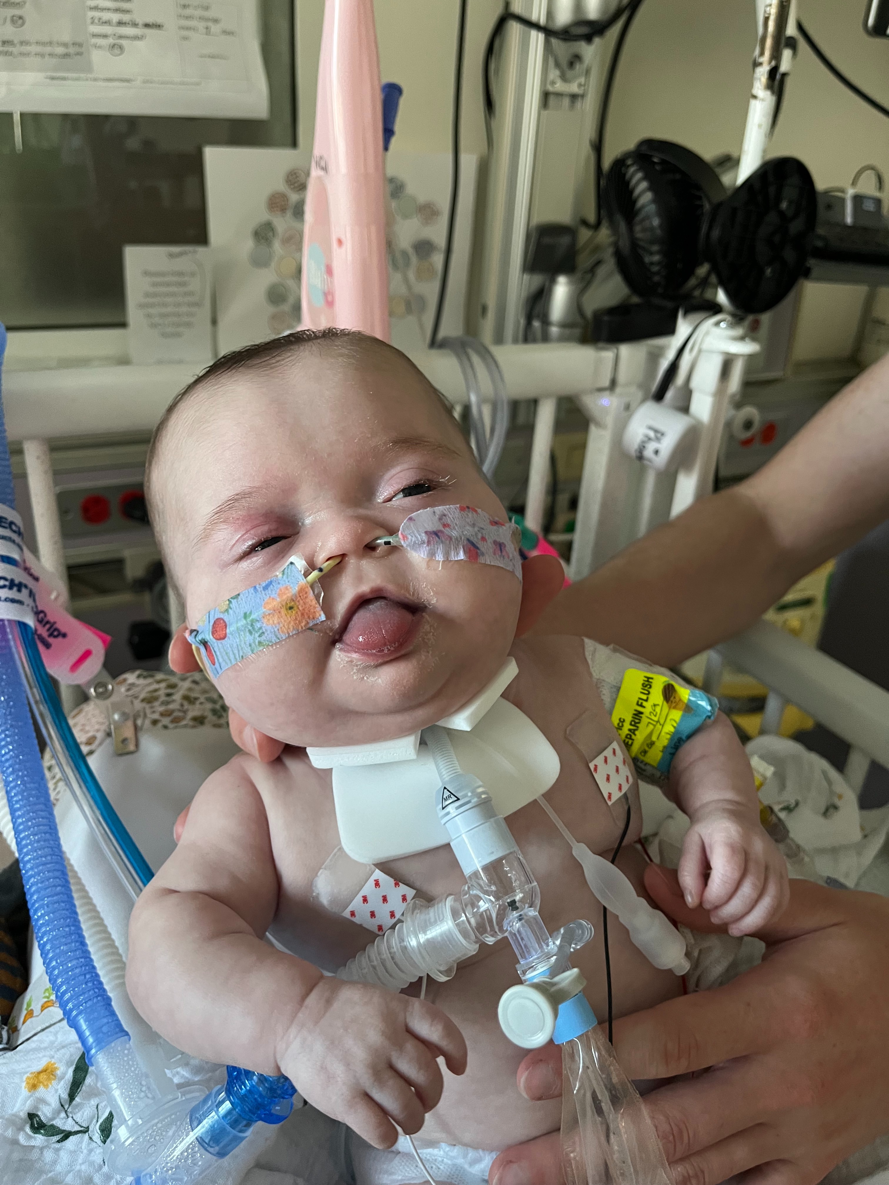 After discussing with the doctors and weighing our options on what would be best for Phoebe, we decided to go forward with a tracheostomy. On July 10th, she had tracheostomy surgery to support her breathing long-term and a g-tube tube placed for feedings to give her the nutrition she needs. These surgeries were intended to help stabilize Phoebe to progress developmentally and beginning planning a path towards bringing her home. The trach has healed well, but complications with the g-tube have caused major setbacks. Her stomach has prolapsed from her g-tube site and we are at a point where she will need to go back to the OR to either revise it or take the tube out completely. We are unsure which route we will go and when that surgery will happen. Currently Phoebe is on a paralytic to prevent further prolapse as we await to hear from the surgeons in coming days about the best plan of action moving forward.