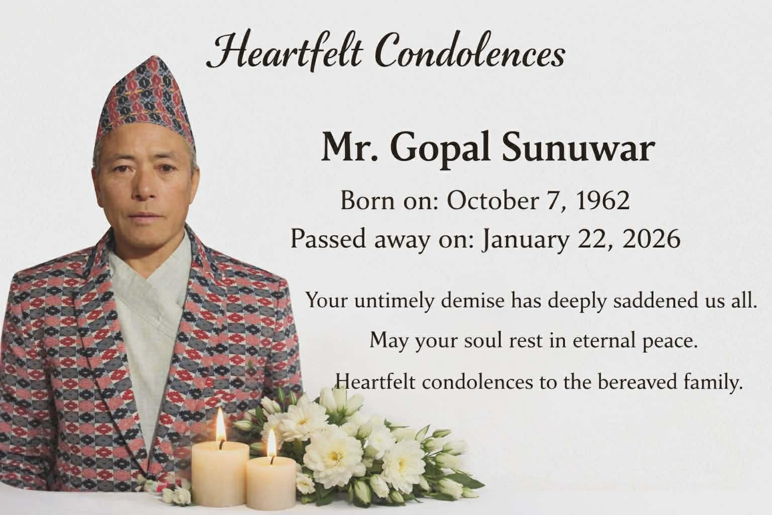 We are raising funds to help cover funeral expenses. also known as Mano chamal for our beloved father Gopal sunuwar.any support prayers.or sharing during this difficult time is deeply appreciated.Thank you for your kindness
