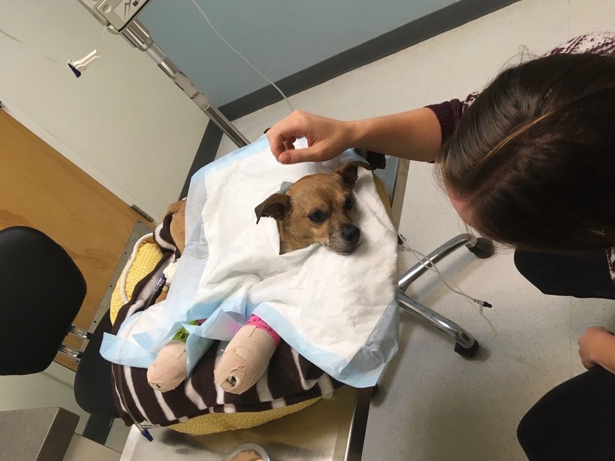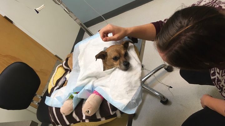 Driving to an appointment you never think your life will change but when I saw a little pup laying in the middle of an offramp and hear squealing I knew it would. This little one was laying on his side helpless while car after car drove around him. I scooped him up and he instantly stopped squealing. I put him in a blanket in my car and rushed him to the hospital. He was bleeding from his mouth and I was convinced he would die on our 10 minute drive there. On the way I call my wife to let her know and confirm that we could try to pay for some of the vet bills I knew he would have. Thank goodness we both love dogs. The vet did x-rays and found two “remarkably broken” front legs and a broken jaw. He was thankfully okay beyond that and some minor bruising. They handed me the estimate for splinting his legs and his pain management and it for sure added up. And this is just the beginning. He will need extensive surgery on his front legs and lots of teeth work to take out the teeth that got knocked loose. We did not expect to have a third dog, we did not expect these vet bills but we refuse to let this little boy suffer and we know if we took him to a shelter they would put him down. We do not know where his owner is and the chip he had led nowhere. We will be doing what we can to find his owner or find him a home that will best suit him, but for now, he’s our new baby and we want to make sure he heals and is not in pain. If you can help us take care of this baby we would really appreciate it, this is the first bill, we will likely have more, but we will do what need to be done and I will keep everyone updated on our pup’s instagram pupswith2moms.