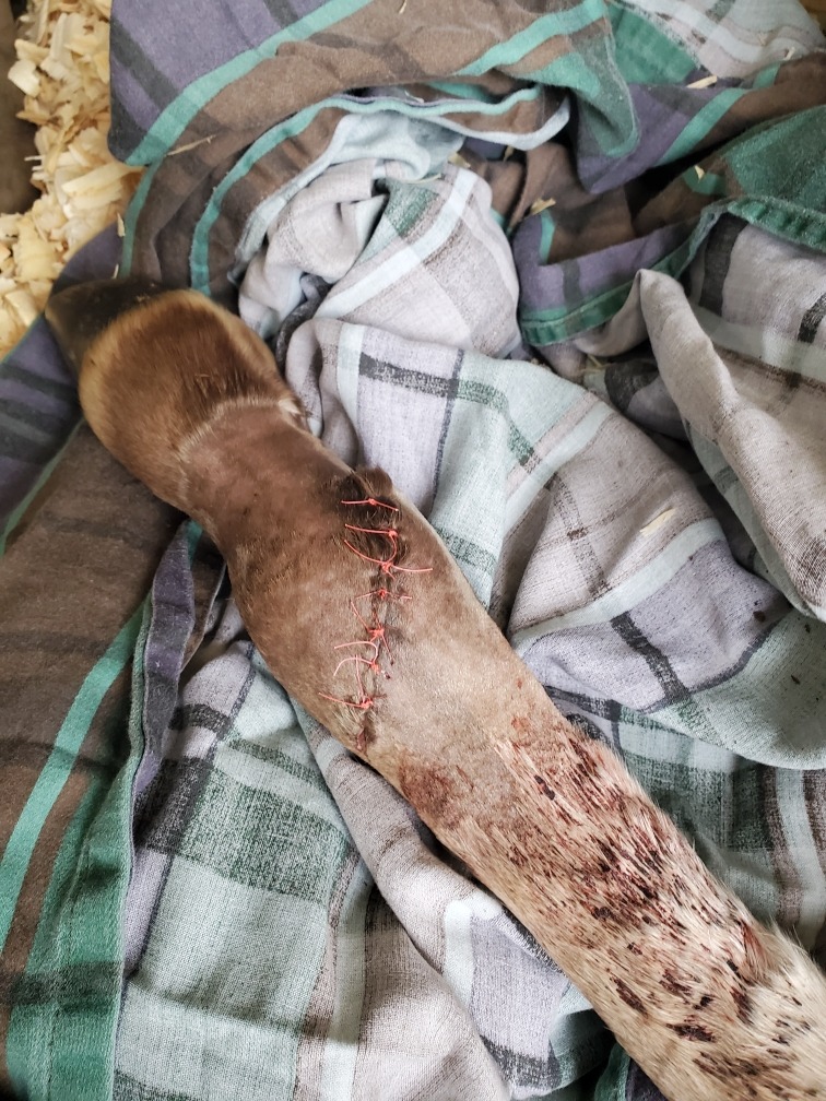 Just a short time ago, Finnigan suffered a devastating injury—a deep cut to the back of his front leg that damaged the fragile tendon sheaths. It’s a serious and painful injury that requires intensive veterinary treatment, including IV regional limb perfusion (IVRLP) therapy, frequent bandage changes, antibiotics, and ongoing pain management.