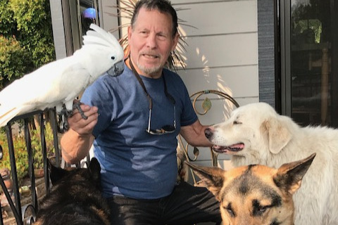Michael jumped on his ATV and headed down his road to only run into exploding, falling trees of fire. At that point Michael knew he had to leave the ATV and flee on foot. After a terrifying 3 mile hike that took over 3 hours on a narrow rocky trail with flames on both sides, Michael with his bird on his shoulder, Mikaela and 3 dogs in tow, made it to Big Basin headquarters were they surprised trapped firefighters when they walked out of the flames. The firefighters couldn't believe their eyes that Michael had emerged from the flames with his animals as the firefighters and several engines were trapped. They spent several hours with the firefighters all waiting to be rescued. At this time there were flames within 10 feet of Michael and and the firefighters. I neglected to mention Michael is 76 years of age.