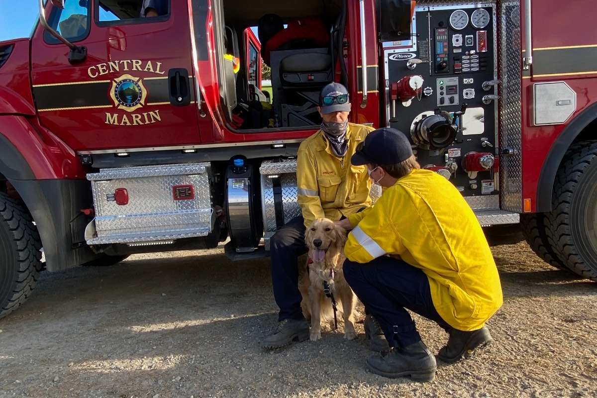 Enter Team Kerith, the Golden Retriever, certified crisis response therapy dog and her handler, Heidi Carman. Through their volunteer work at Marin Health Medical Center’s Emergency Department, Kerith (a Guide Dog for the Blind career changed Golden Retriever) found her true calling. She provides unconditional love and instant stress relief to first responders. She forms bonds with the firefighters by simply being herself: she greets with playful wiggles, adoring eye contact, and makes each person she meets feel important, special, and loved. The experience that Kerith is able to provide can be invaluable to individuals suffering from PTSD symptomology.