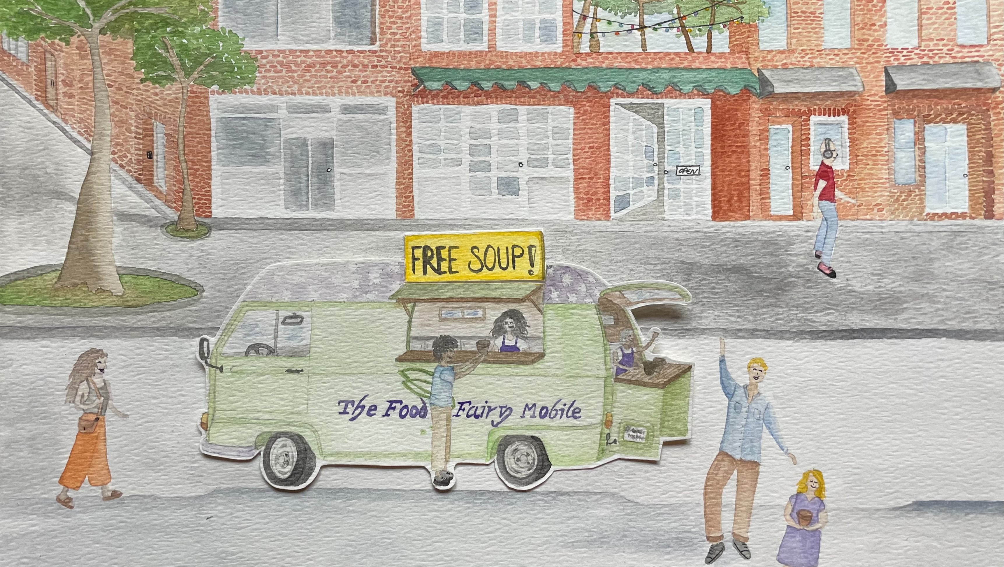 As the illustration above by artist Lucile Moutier depicts, we envision a delightful van meandering through North Carolina country sides and neighborhoods, ringing fairy chimes, and offering free, nourishing soup to anyone in need – families, kids, and seniors alike.