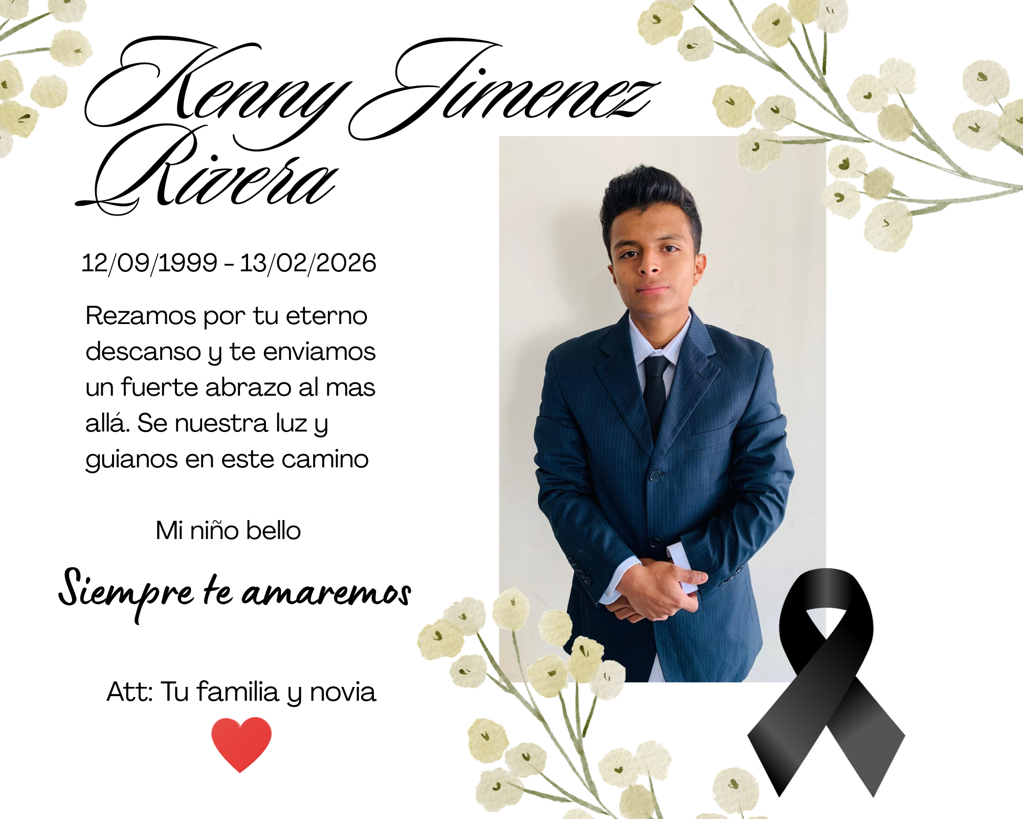 Kenny was a very cheerful, playful, fun-loving, vibrant, and kind young man. He always had a smile for others and made everyone around him laugh. He was a hardworking, loving young man full of dreams. He was always willing to help others and was beloved by his family, friends, and everyone who had the opportunity to know him. He had two younger sisters whom he loved deeply and helped in any way he could. For us, he wasn't just our brother; he was also our support, our protector, and a fundamental part of our lives.