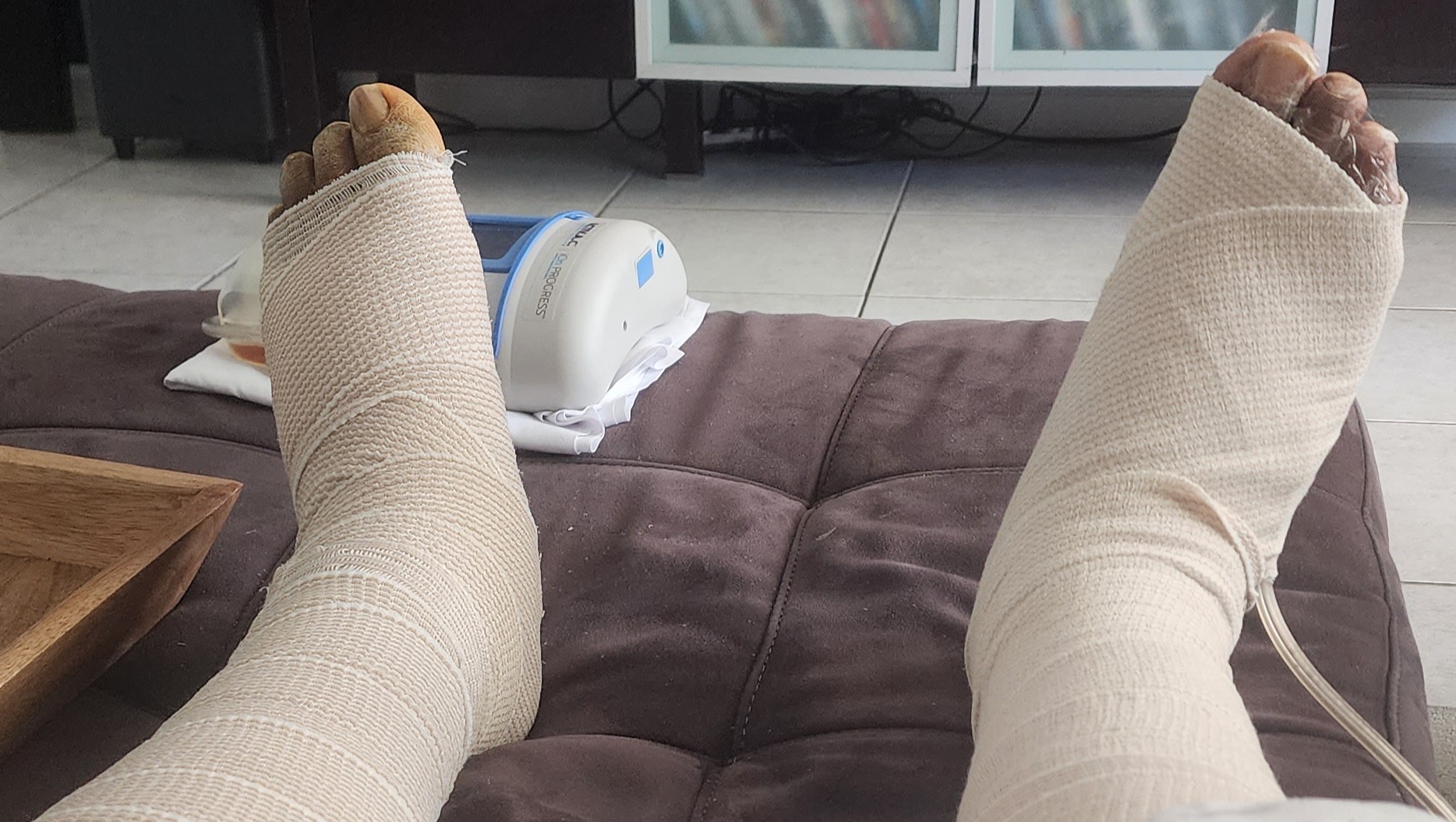 My wife has taken on the responsibility of caring for my daily needs and managing our household, as I am presently unable to fulfill these duties. I underwent debriefment and graft placement on my right leg, and debriefment on the left. Currently, the medical professionals have estimated a four-month recovery period, and it is likely that I will require further surgery on both legs. Consequently, I find myself burdened with an array of medical bills and various life expenses. Regrettably, my condition prevents me from working any longer.