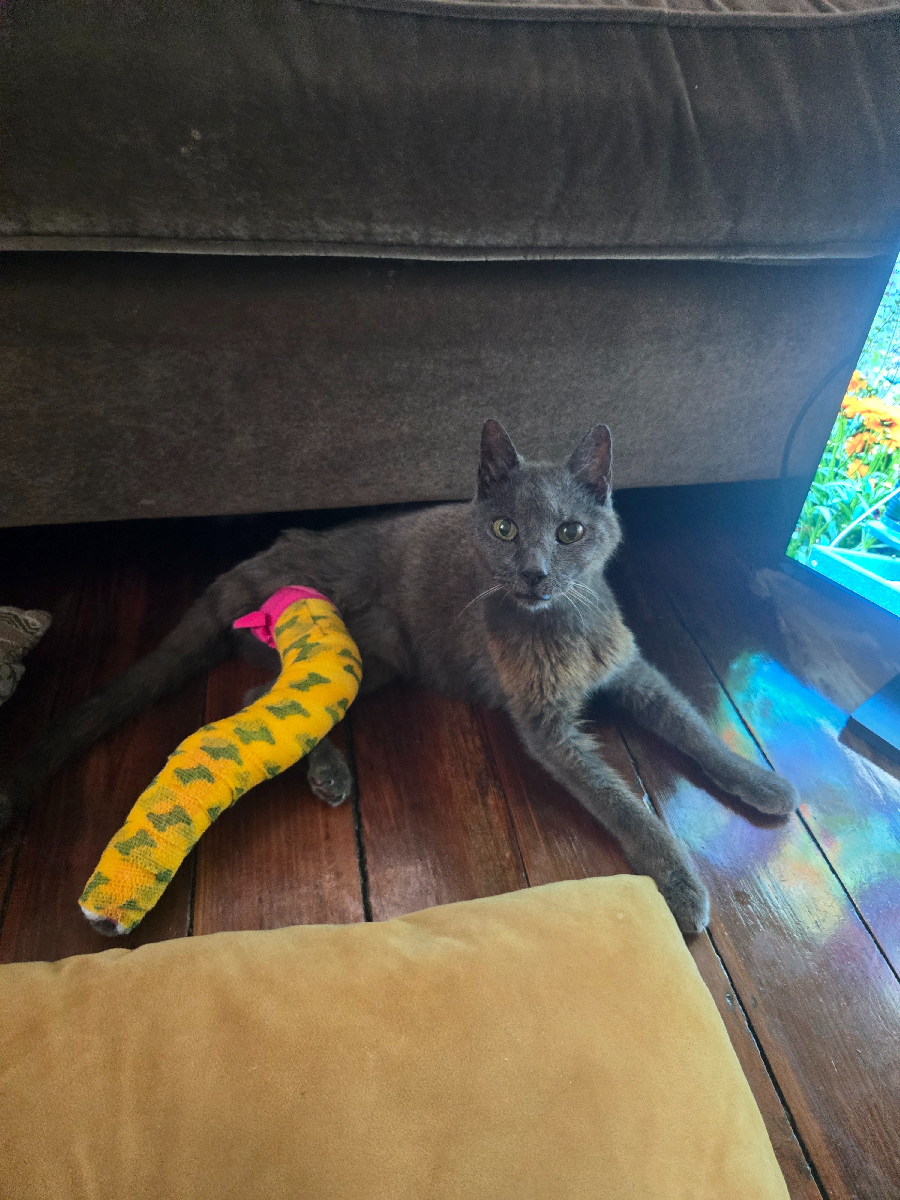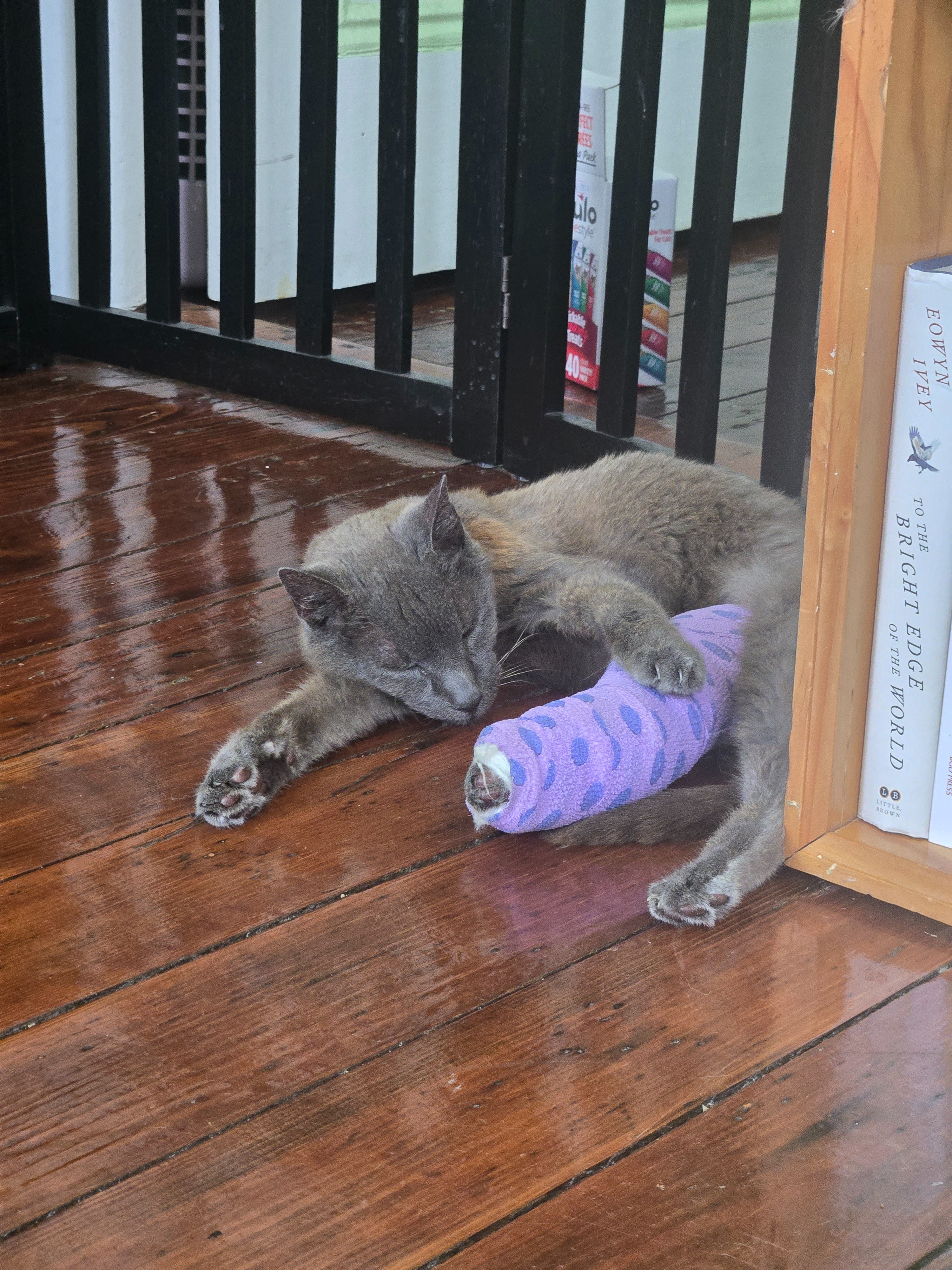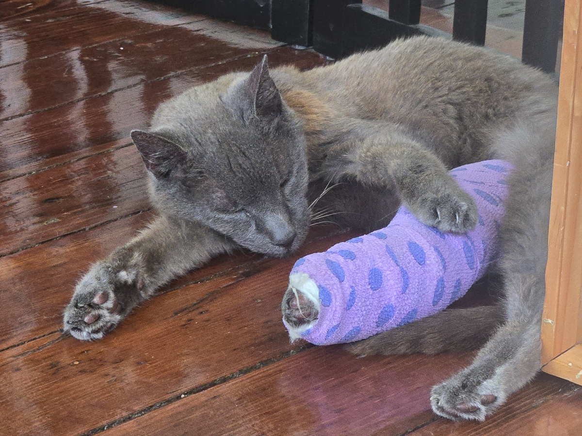 Two weeks ago I came home from lunch and Wolfie had broken her leg outside. She may have gotten caught in the fence she is known to scale, which she has no business doing - she is clumsy! I have been beside myself trying to help her heal her leg - we have been to five different veterinarians and driven far and wide to find a solution that allows her to have a high quality of life. After a lot of consideration, splint changes, and second opinions we are opting to amputate her leg. Common vet wisdom (I have learned) is that cats and dogs are born with an extra leg! We expect Wolfie to make a full recovery very soon!