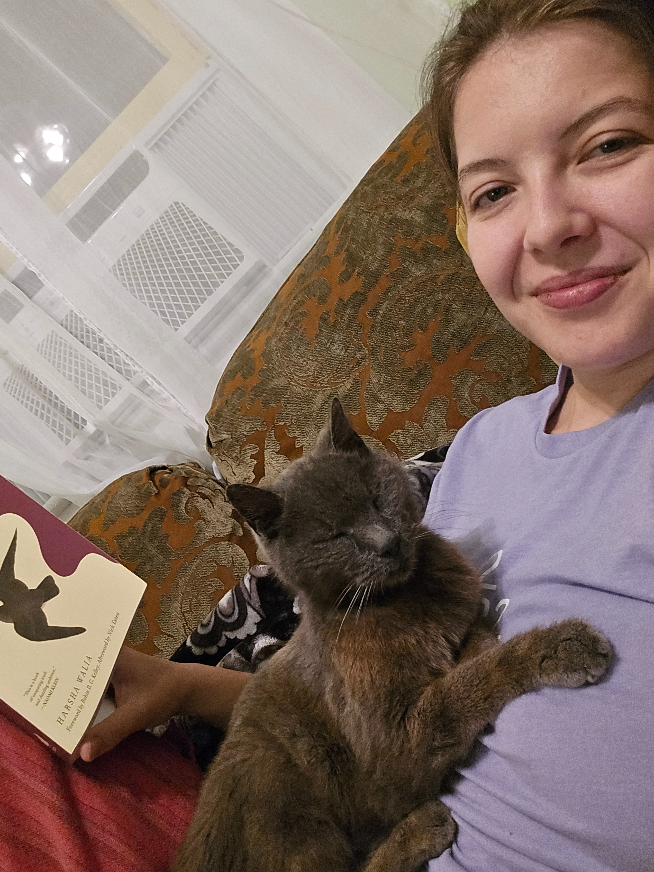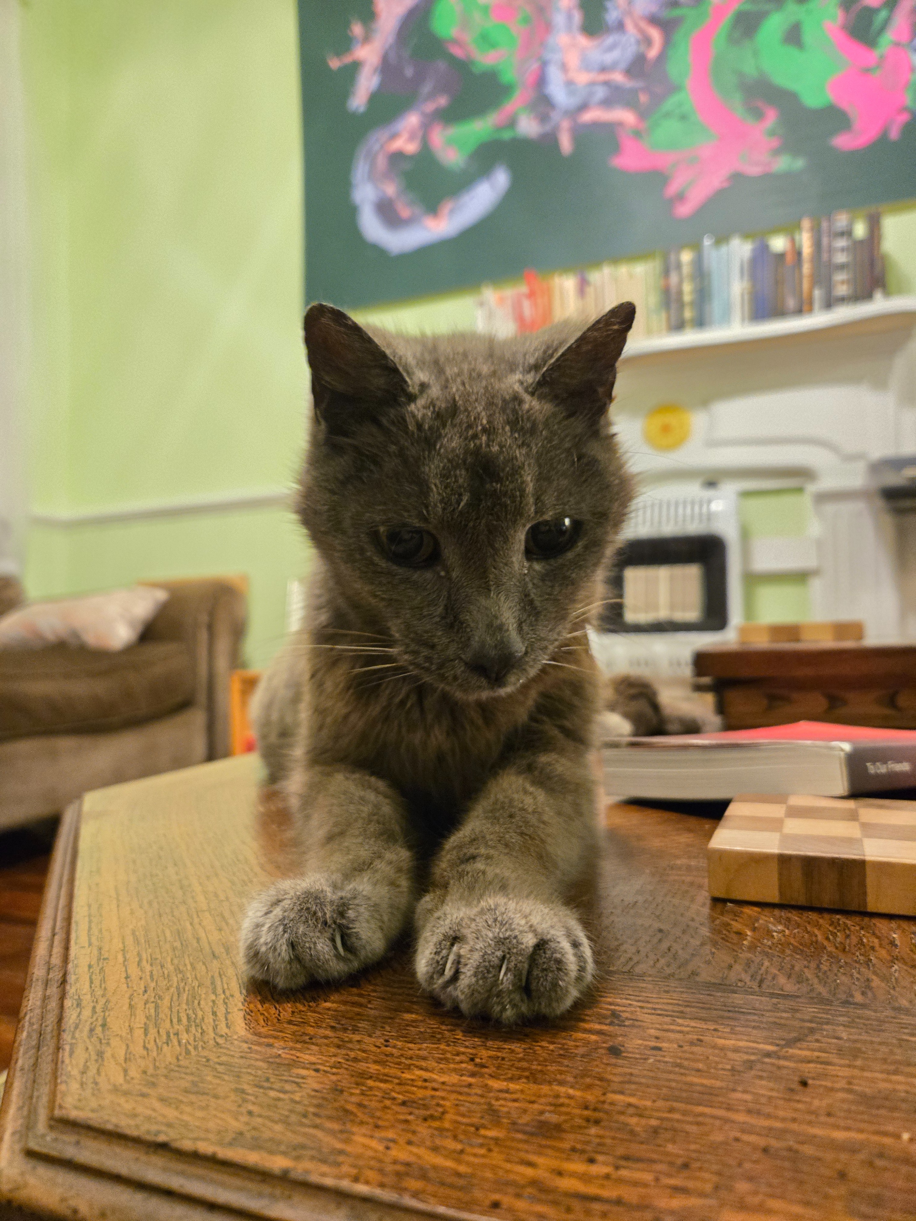 Wolfie was living on the street outside my house since the day I moved in, when she tried to let me know she was home by immediately strolling in the front door. It wasn't until a snowstorm that I let her stay inside for the night, not realizing we would soon be inseparable! I then adopted her as a first-time cat owner, living alone, and she has since become my best friend and constant companion. Wolfie loves to be together, and all day she migrates with me to my office (she has her own chair), cooking in the kitchen, reading on the couch, or snuggling up to sleep. I am not sure her story before we met - we know she had been outside for at least a year but she is estimated to be 14 and without a chip or ear crop we can only assume she was dumped or lost from her first home. Her companionship has meant the world to my heart, my soul, and my mental health! She is magical and intuitive and my spiritual familiar.