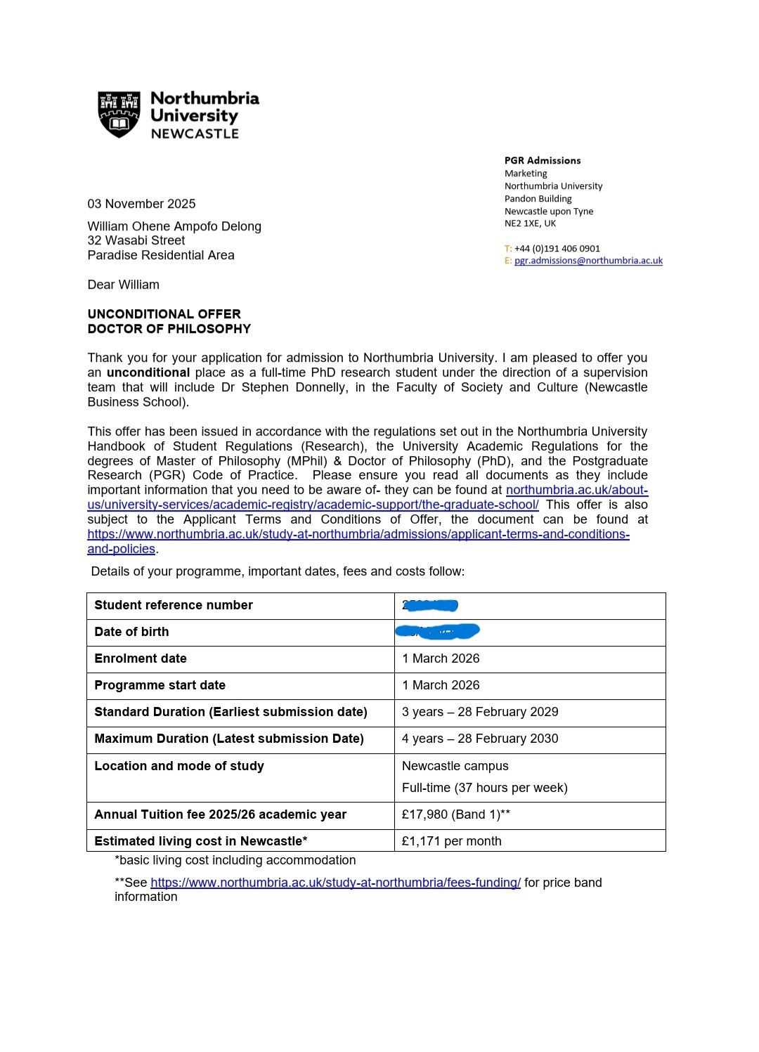 I am now honoured to have received an unconditional offer to begin a full‑time PhD in Accounting and Financial Management at Northumbria University starting March 2026. This PhD is a crucial step toward becoming a researcher whose work contributes to policy, governance, and societal development.
