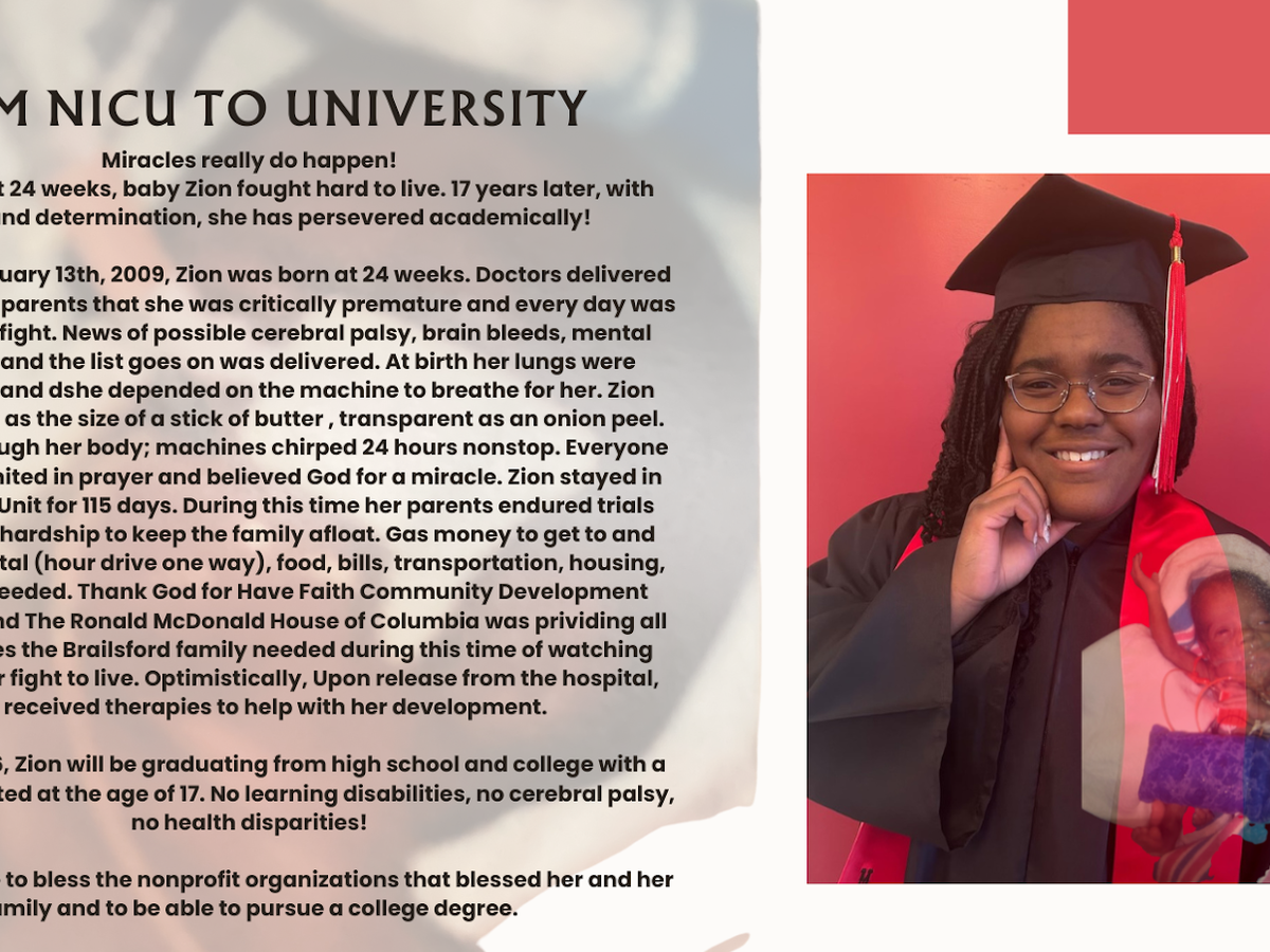 Born 1lb 3oz at 24 weeks, baby Zion fought hard to live. 17 years later, with prayer and determination, she has persevered academically!