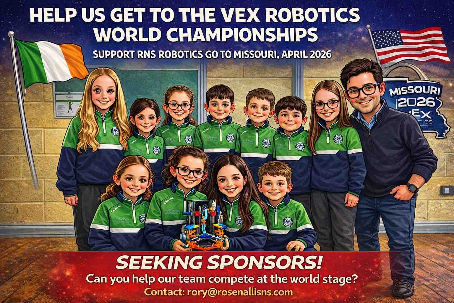 As All Ireland champions in the teamwork section and the first Primary School in Laois and Leinster to win the All Ireland, we have been invited to represent Ireland in the VEX World Championships in St Louis, Missouri from 28th-30th April. Our participation in this is dependent on us raising enough funds to travel to this competition, which is no easy feat for a 74 pupil school in rural Laois.