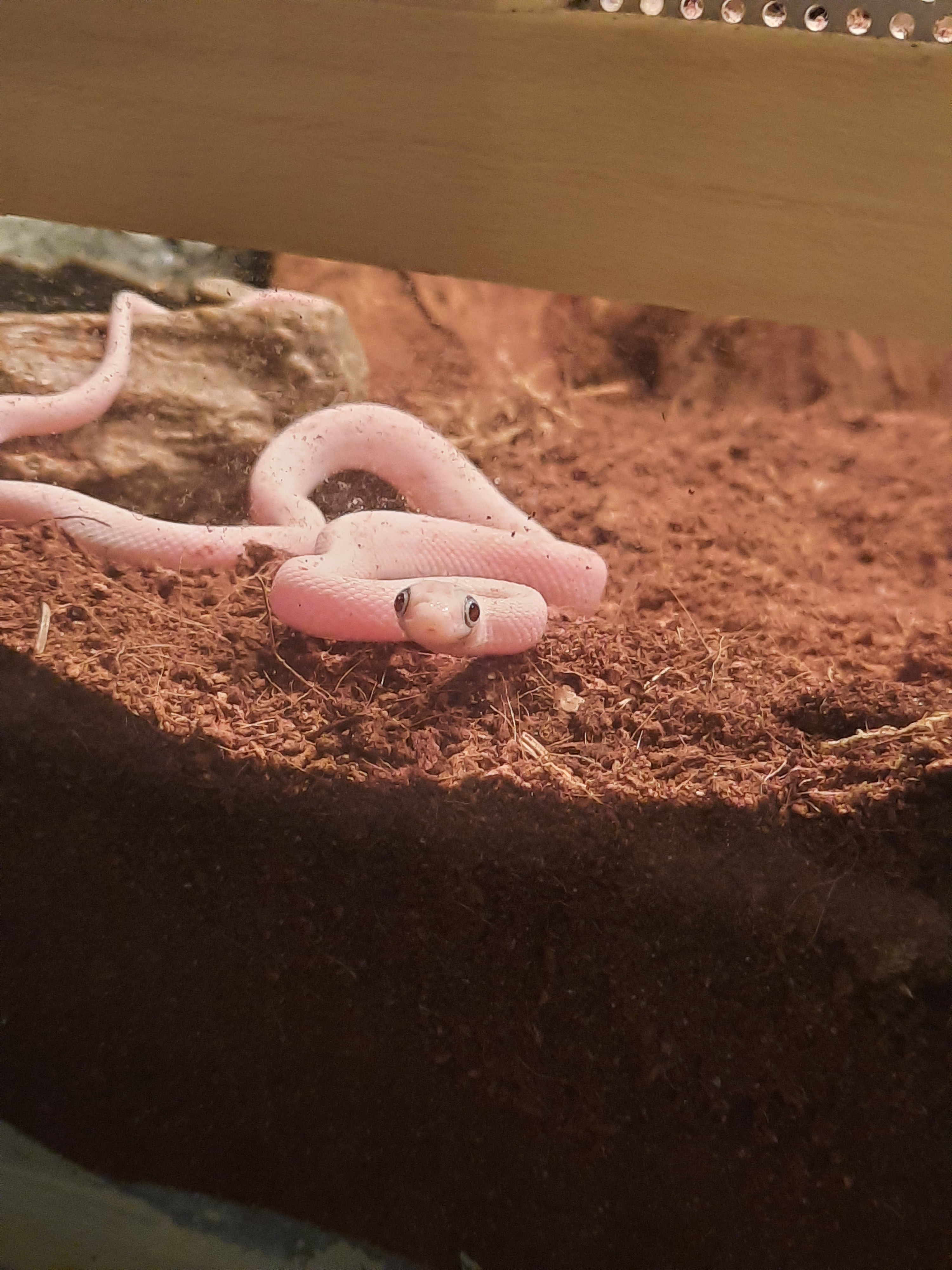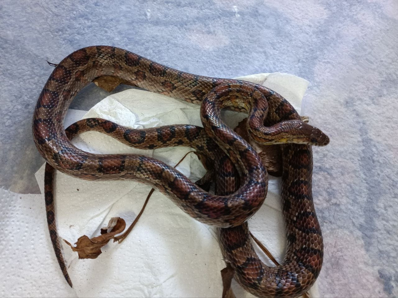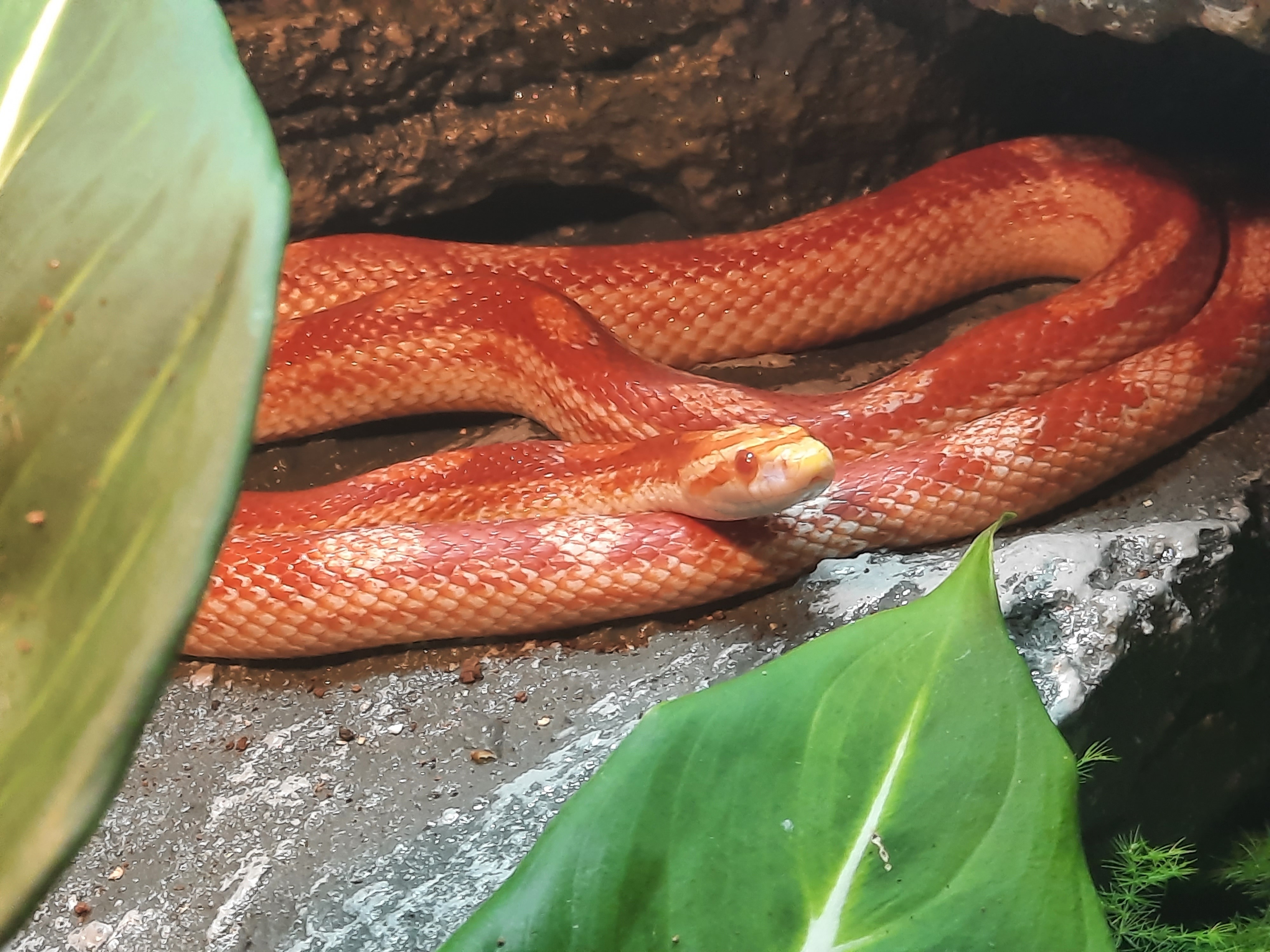 Hier sieht man unsere erste Kornnatter, die im Hinterhof unseres Wohnhauses gefunden wurde. Er hatte starkes Untergewicht und einen Magen-Darm-Defekt, worauf wir ihn mit Spritzen und spezielle Futtermethode aufgezogen haben.