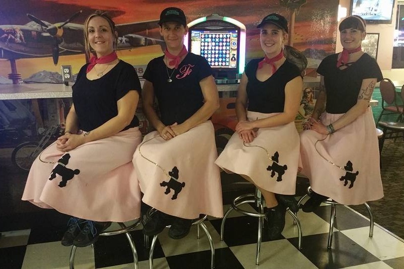 We love our restaurant, which is a 50's style diner, with 57 Chevy booths and all. Our girls wear poodle skirts on our Cruise Nights every month, which is a local Cruise-in for all the hot rods and classic cars.