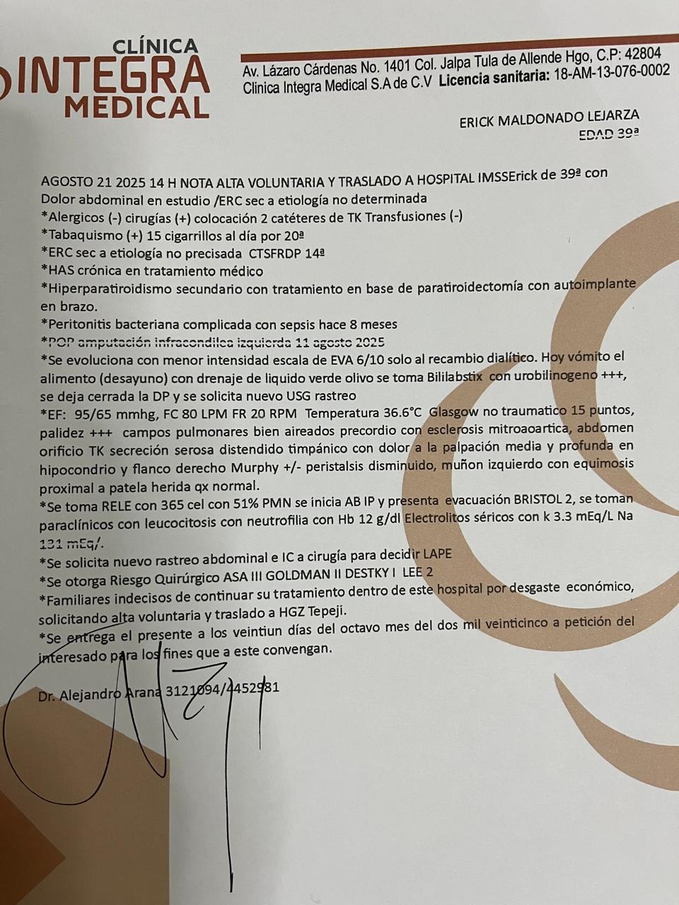 Pese a toda la gravedad en su salud logró salir de la cirugía, sin embargo su peritoneo está tan dañado que ya no es posible seguirle haciendo diálisis por este medio, es necesario empezar a hacerle Hemodiálisis.