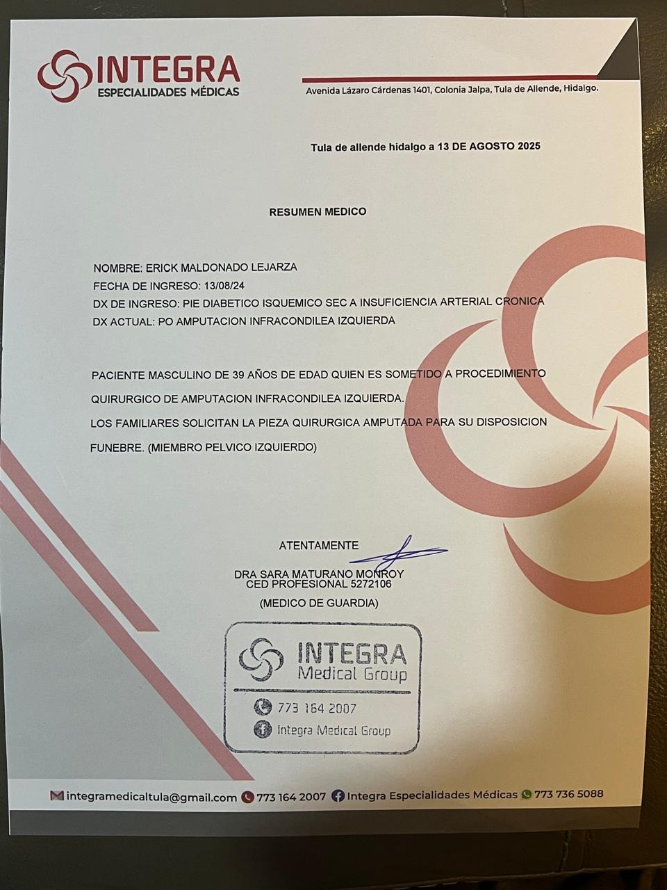 Desde el inicio de su enfermedad le colocaron diálisis peritoneal, en el año 2023 fue operado de la glándula paratiroidea pues sus niveles de calcio y fósforo estaban tan elevados que se empezaban a calcificar sus articulaciones, los dedos de sus manos empezaron con acropaquia y problemas en el cuello para mantener erguida la cabeza, la cirugía frenó un poco el deterioro de su salud, sin embargo anemia, hemorragias nasales, dos cuadros de peritonitis la penultima vez con sepsis, que logró superar, todo por el amor a nosotros, sin embargo hace un mes su salud ha empeorado, un dolor de pie terminó en una amputación de pierna por la calcificación de venas y arterias, eso representó un golpe muy duro para él y para toda la familia, su ánimo decayó sin embargo estuvo dispuesto a seguir adelante, una semana después presentó otro cuadro de peritonitis e ingresó de nuevo a cirugía, donde le hicieron una cirugía exploratoria de abdomen para ver de donde procedía la infección, fué la vesícula que estalló y se derramó la bilis en el peritoneo, después de varias horas de cirugía, lavado y mucha medicina, le pusieron un catéter en el cuello para pasarle medicamento pues la propia anemia y cirugías lo tenían muy débil.