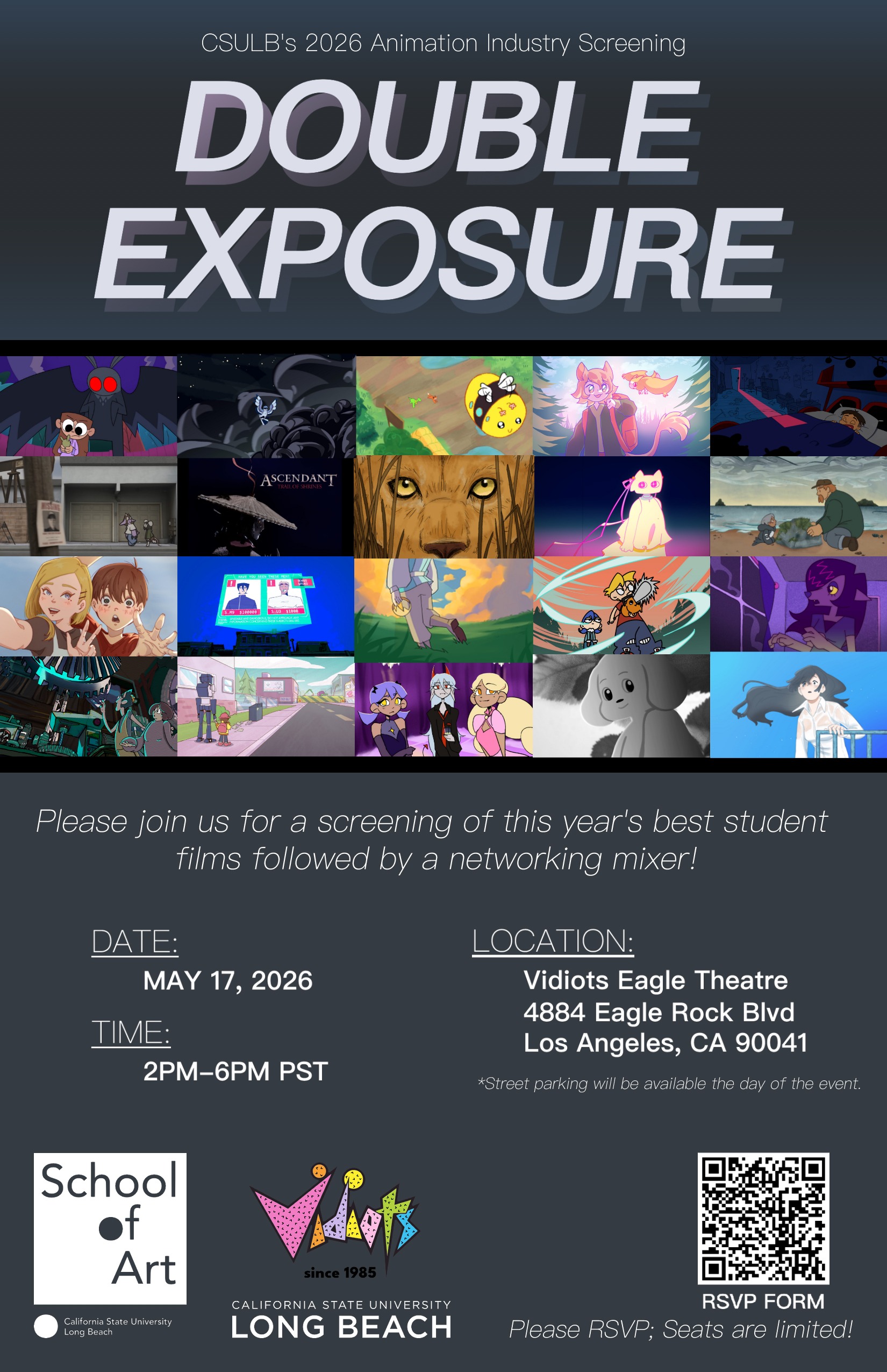'Double Exposure' is an industry screening of films from animation students at California State University Long Beach! This showcase offers a first look to many notable recruiters and artists from the film & television industry to see the best work from the Animation program and meet our students to help paving a path to their future careers.