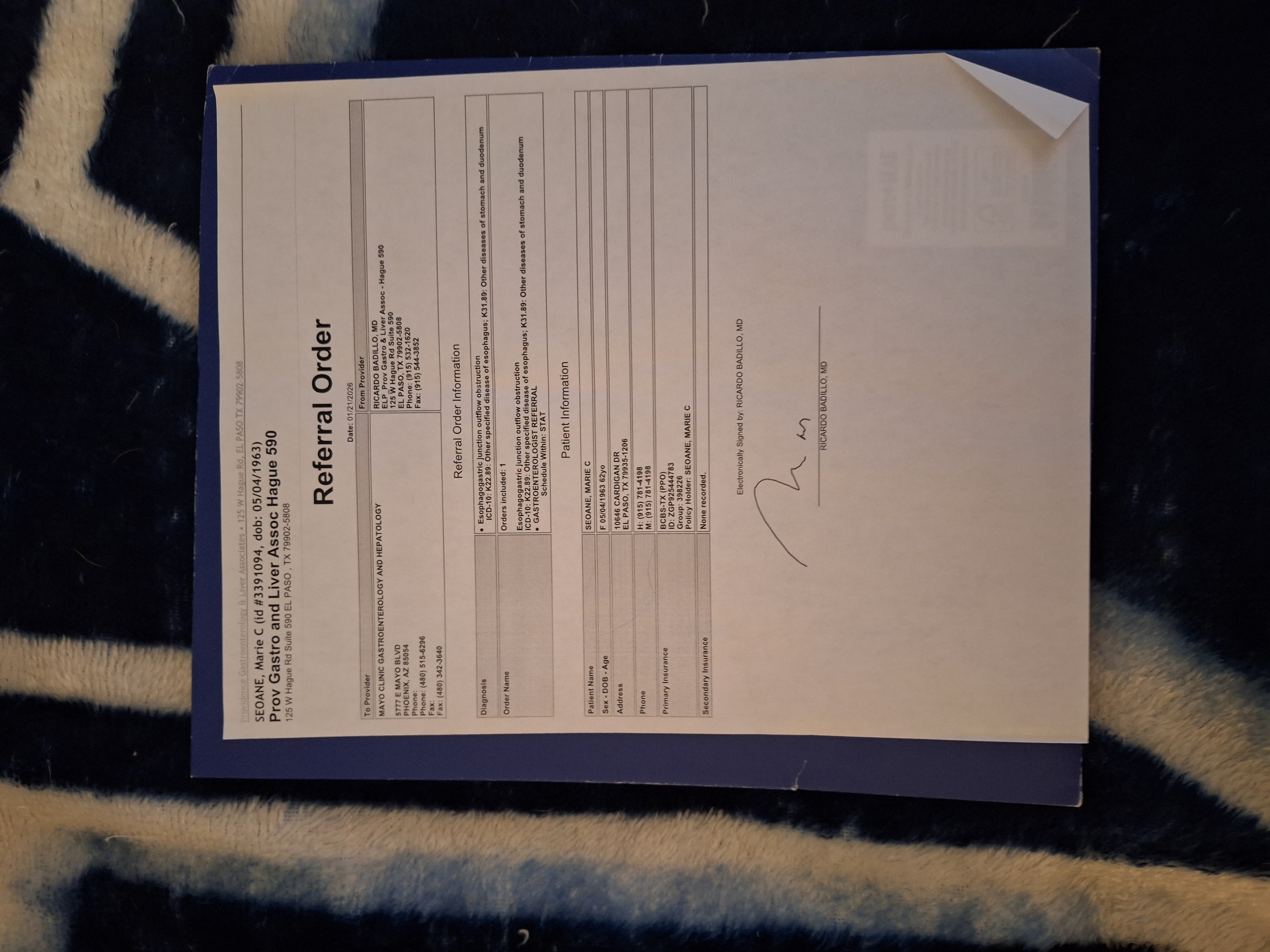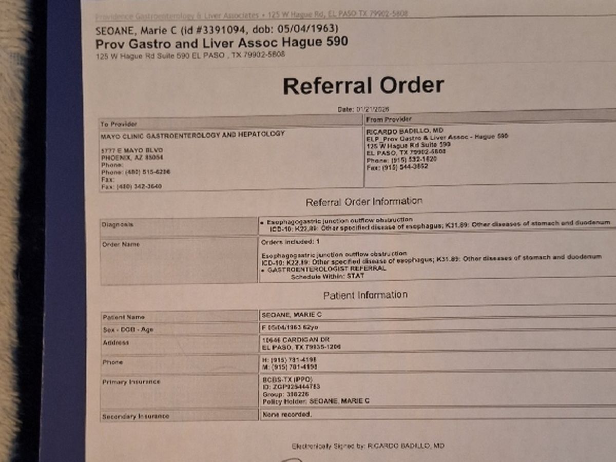 Today Febuary 3rd I got the call from Mayo Clinic in Scottsdale Arizona that the Gastreontology department has accepted my case. To those that are not aware I have been diagnosed with Achalasia. Achalasia is a rare swallowing illness where the lower esophagus sphincter fails to relax. It affects 1 in 100,000individuals annually in USA. In El Paso all help has failed. The last hope was injecting Botox to the sphincter which was done 1/14 but failed. I'm to the point that is has come I'm fighting for my life. As no surgeons in El Paso Tx wont take my case, Mayo Clinic at Scottsdale Arizona has. It will be out of network so I'm responsible for the first $3200.00 then afterwards I'm responsible for the 20 %. Mayo has informed me it will be multiple trips the first 2 months. I'm also responsible for trip, lodging, meals etc. As I'm in fix disability I'm not able to cover my trip nor deductibles. Need to be there middle of May.