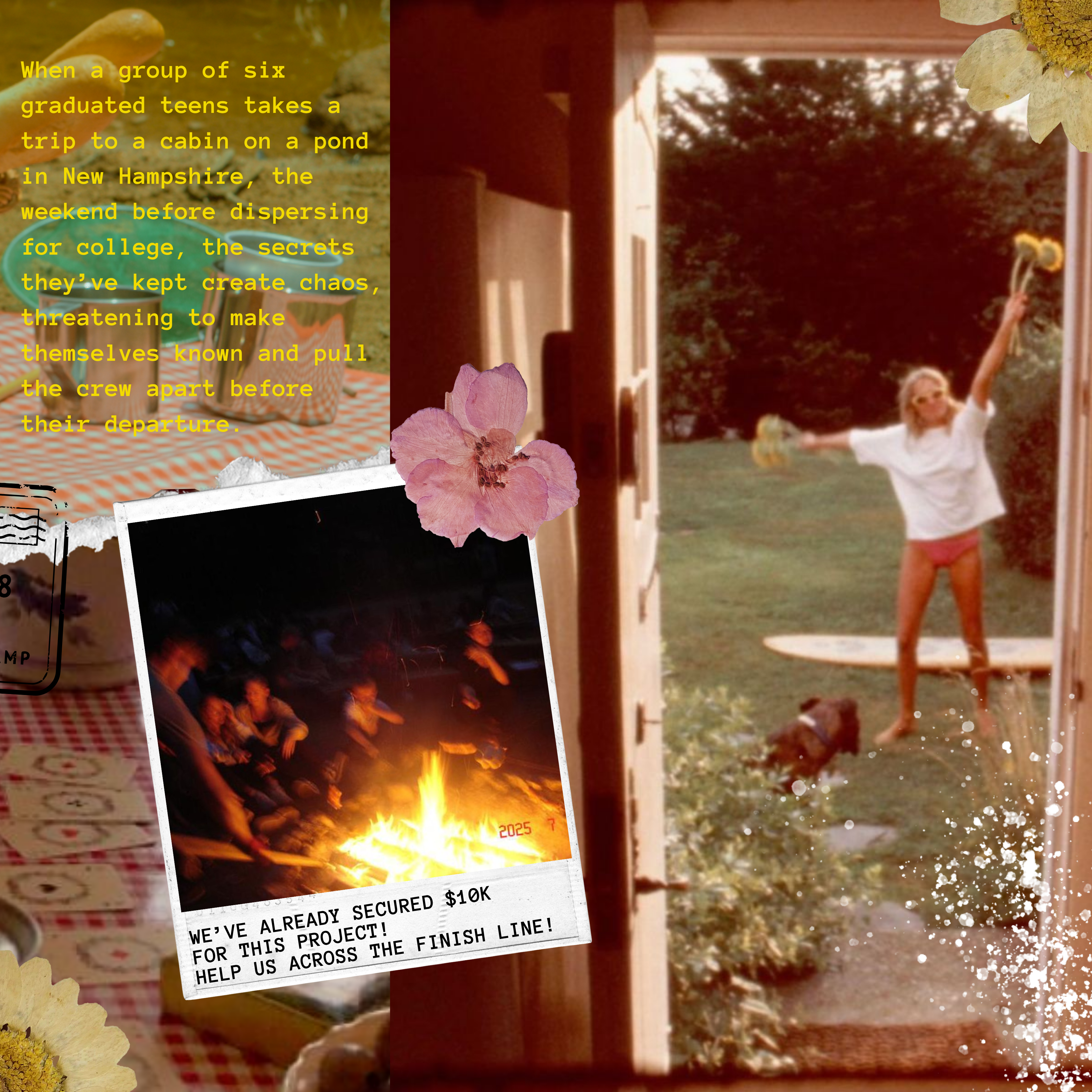 Set in a small cabin by a pond in New Hampshire, pull/drift is an ensemble coming-of-age comedy. When a group of six graduated teens take a trip the weekend before dispersing for college, the secrets they’ve kept threaten to make themselves known and pull the crew apart.
