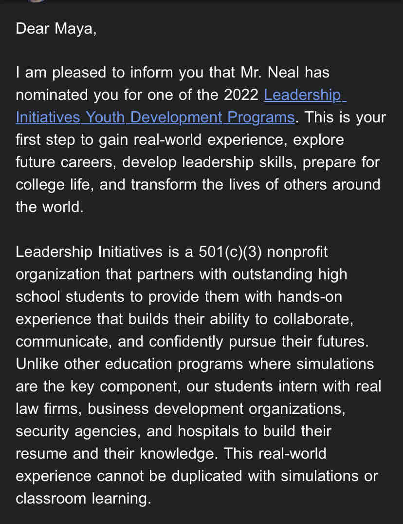 I recently got information from my school about an incredible opportunity. The nonprofit company "Leadership Initiatives Youth Development Programs" has several summer programs including a week-long advanced medical neuroscience internship in Washington DC. Not only will I participate in incredible research related to the career I want to go into, but the program also provides SAT prep, letters of recommendation, college essay assistance, and other important information that will help me in my college search process.