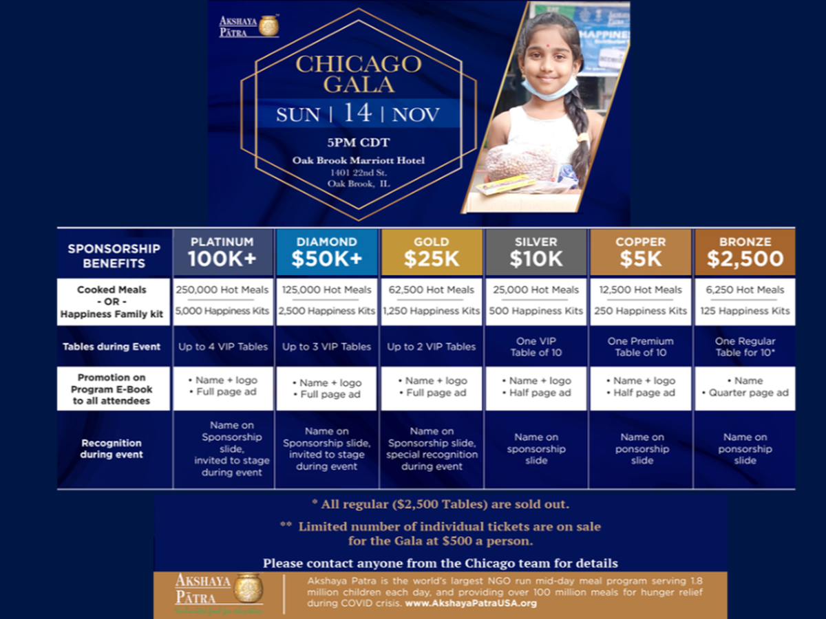 Rajeev & Sanjay invite you to help raise money to feed underprivileged kids in India by donating to Akshaya Patra Foundation. Your donation will be fully tax deductible. We have set our goal to raise $150,000 for this effort. We have already raised $90,000 through direct donations to Akshya Patra and are hoping to raise another $50K thru GoFundme. Hopefully, you will contribute generously. Please also consider sponsoring a Table for the Gala scheduled for Nov 14th, 2021. Premium Tables are $5,000 and VIP tables are $10,000.