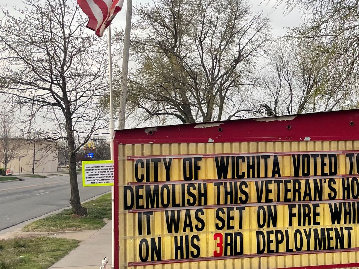 Even with the evidence of the limited damage of the fire the City of Wichita voted to condemn the house and proceed with a ten day notice to remove all my personal items and to begin demolition. I then placed the sign in my yard with my American Flag on it Saturday morning and Monday morning at 3:30 someone was caught on camera lighting my flag on fire.
