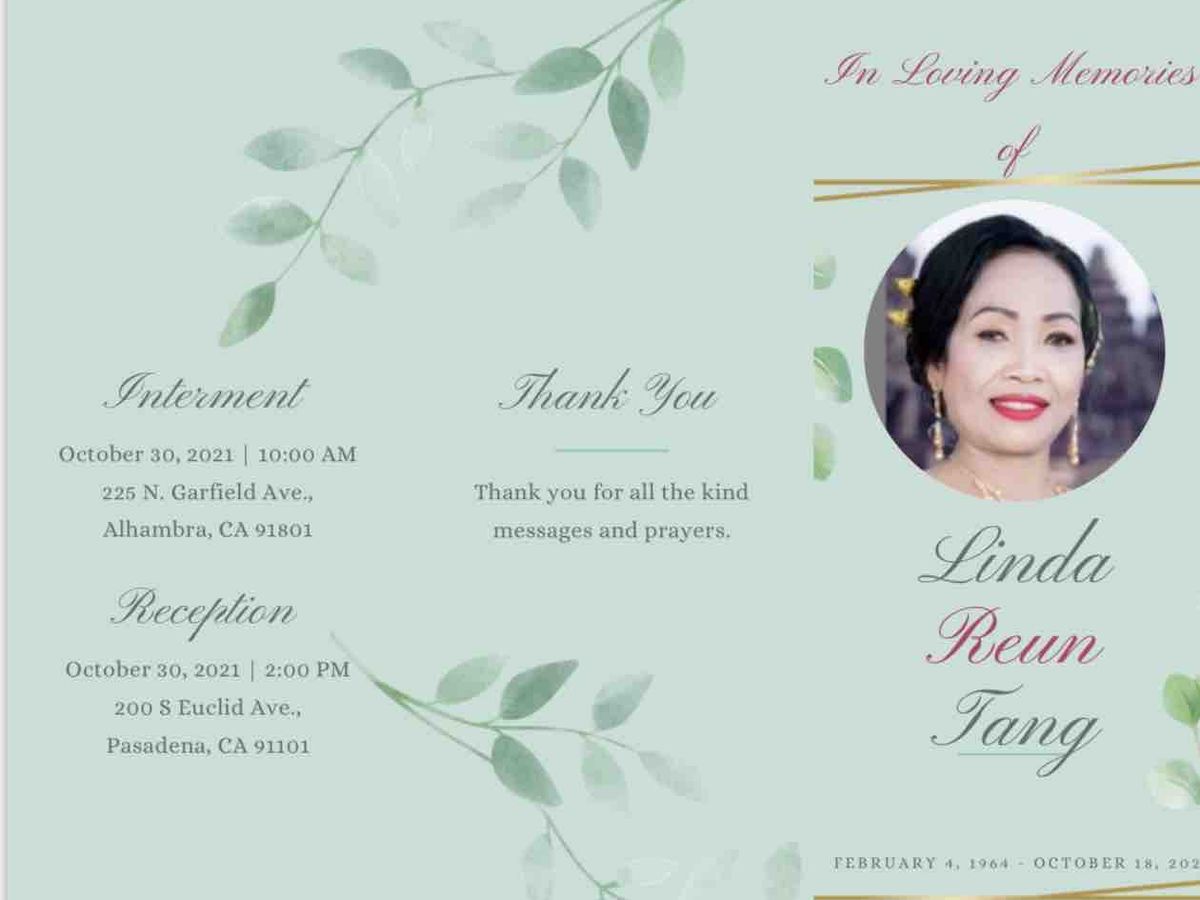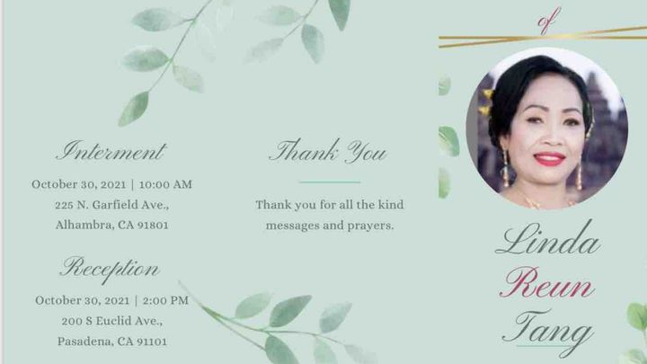 It is with a heavy heart that we inform you the passing of our beloved mother, Linda "Reun" Tang, age 57 on October 18, 2021. Our mother has battled for several years with chronic illness and it was inevitable that her time to be at peace with God and her soul risen to heaven was to be so soon.