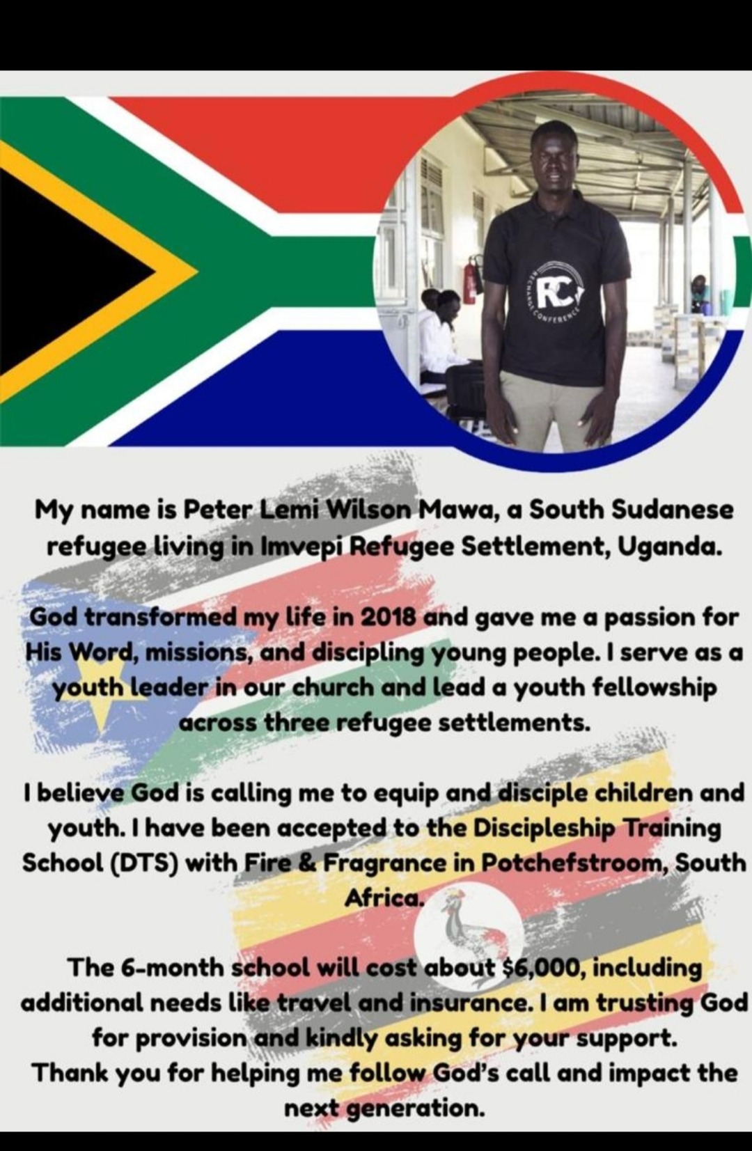 Hallo, ich sammle für einen südsudanesischen Freund auf der anderen Seite der Erde (Uganda) . Ich durfte ihn erstmals 2022 auf einem Seminar kennenlernen. Sein Leben ist sehr stark geprägt von Flucht, Hunger und Not. Er hat und erlebt weiterhin schreckliche Dinge, die wir uns in unserem Leben nicht vorstellen können. Doch in all seinen Lebenssituationen hat er steht's Hoffnung und will diese anderen weitergeben und engagiert sich stark in die Kinder und Jugendarbeit. Nun braucht er finanzielle Unterstützung für eine Weiterbildung die ihm gerade dabei helfen soll den jungen Menschen in den südsudanesischen Flüchtlingslagern im Norden Ugandas, Hoffnung zu geben und sie in ihren extremen Lebenslagen zu unterstützen.