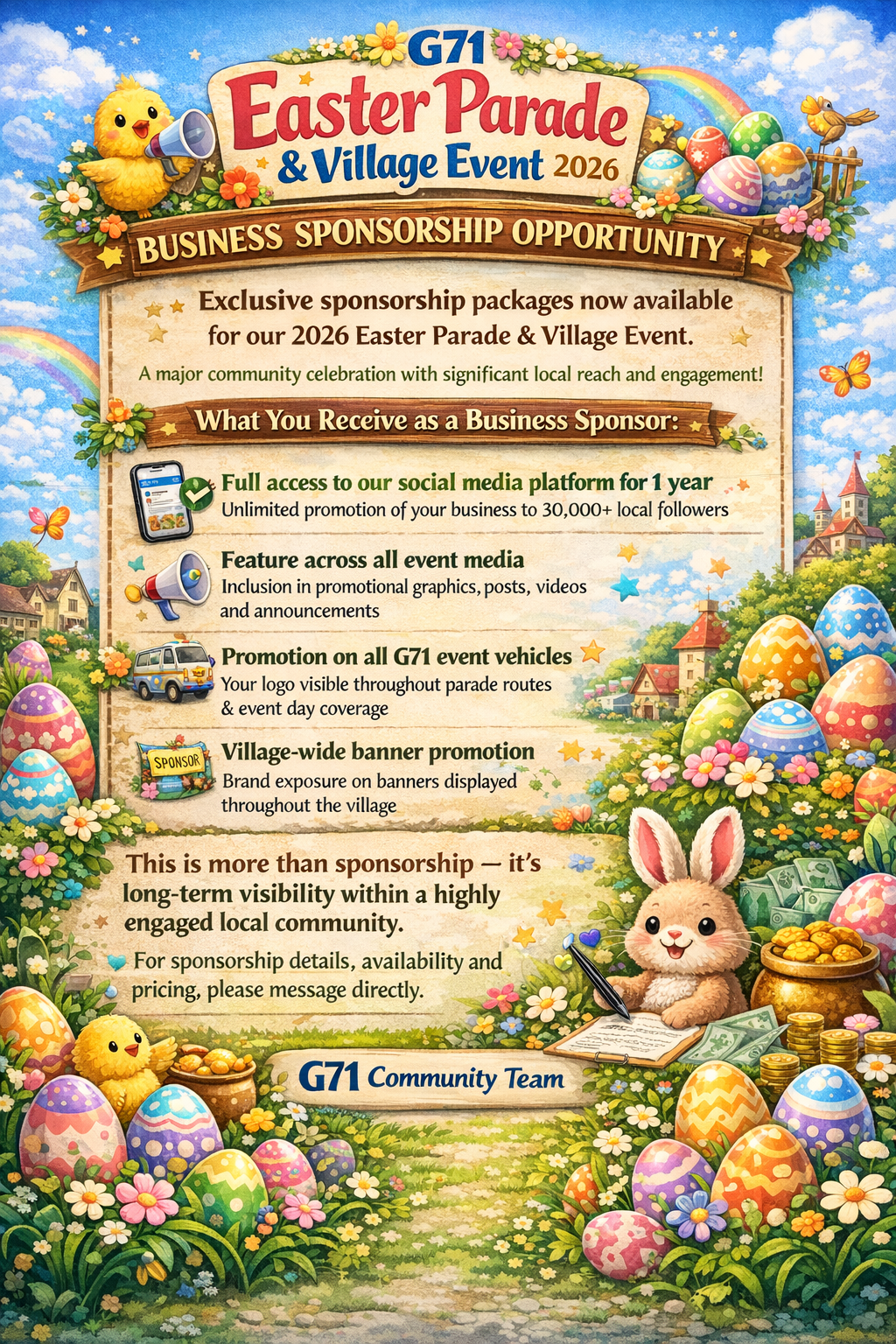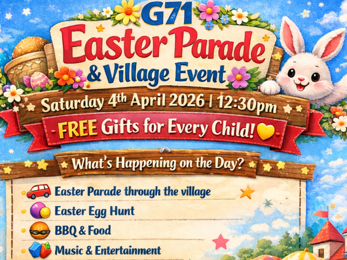 We’re delighted to confirm that the G71 Easter Parade & Village Event will take place on Saturday 4th April 2026 at 12:30pm — and once again it will be a completely FREE community event for all families to enjoy!