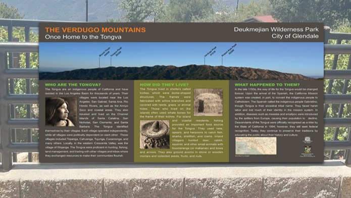 My name is Gabriel Venezia and I am a Life Scout from Troop 319 in La Crescenta, California. I am at the final stages of my Eagle Scout Project, which is creating an informational sign showing peaks of the Verdugo Hills, as well as information on the Tongva Indians. I made my best attempt to follow the design style of the nature exhibit in the stone barn. Once the sign is constructed, it will be placed in the back patio of the Stone Barn Nature Center at Deukmejian Wilderness Park. The sign itself will utilize an Izone process that prints directly on metal, which is why it is costly, but will last at least 15-20 years. The attached image shows how the sign will look and be placed in the patio.