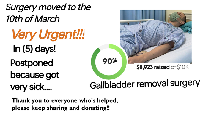 Surgery has been moved up to next week on the 19th. Need to collect balance of fees as soon as possible. Please, help if possible, share where you can. It's urgent. Thank you