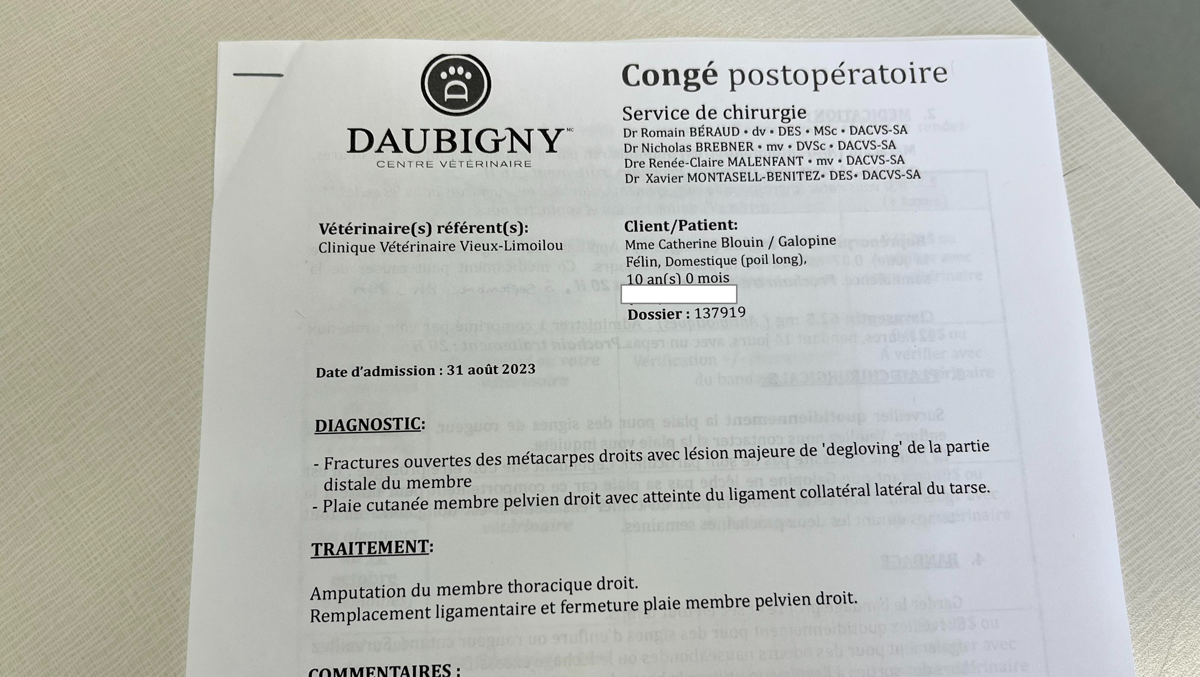 TL;DR: Notre belle Galope s'est fait frapper le 31 août dernier sur la 6e rue par une voiture qui faisait de la vitesse. Suite à ses blessures, elle a dû se faire opérer d'urgence à Daubigny pour se faire amputer la patte avant droite et elle doit porter une attelle sur la patte arrière droite pendant près de deux mois. Les frais vétérinaires totalisent plus de 7 000$. J'apprécierais toute assistance pour payer ses frais vétérinaires que vous pourriez m'accorder. Merci en avance!
