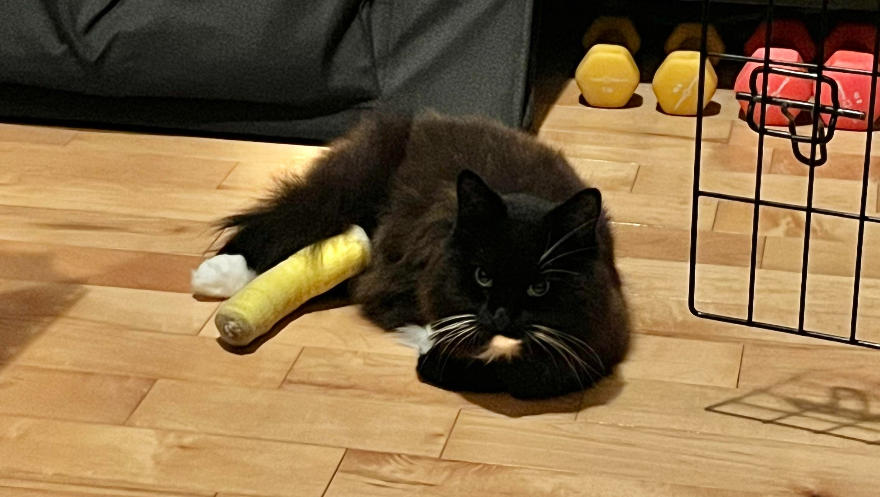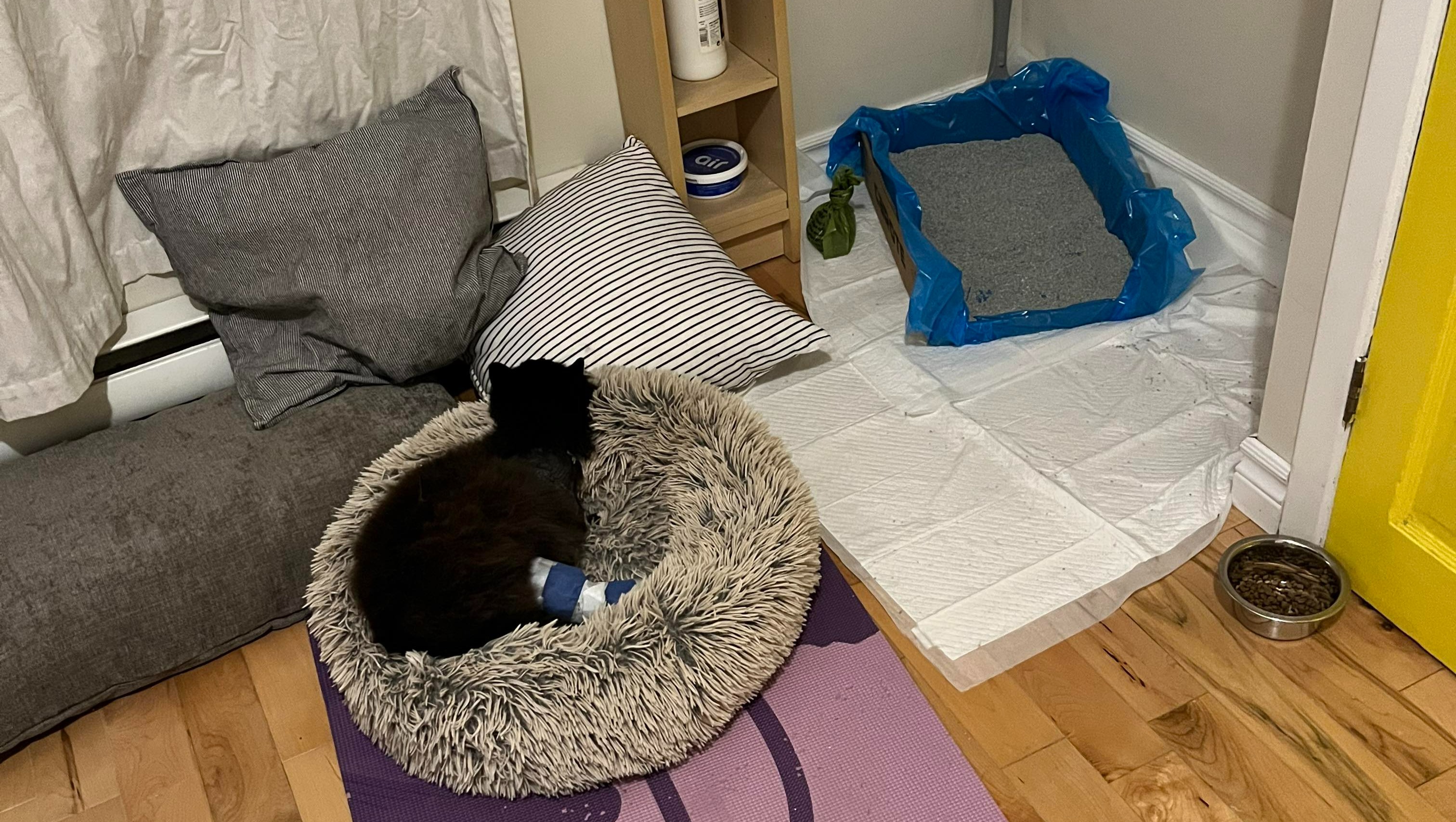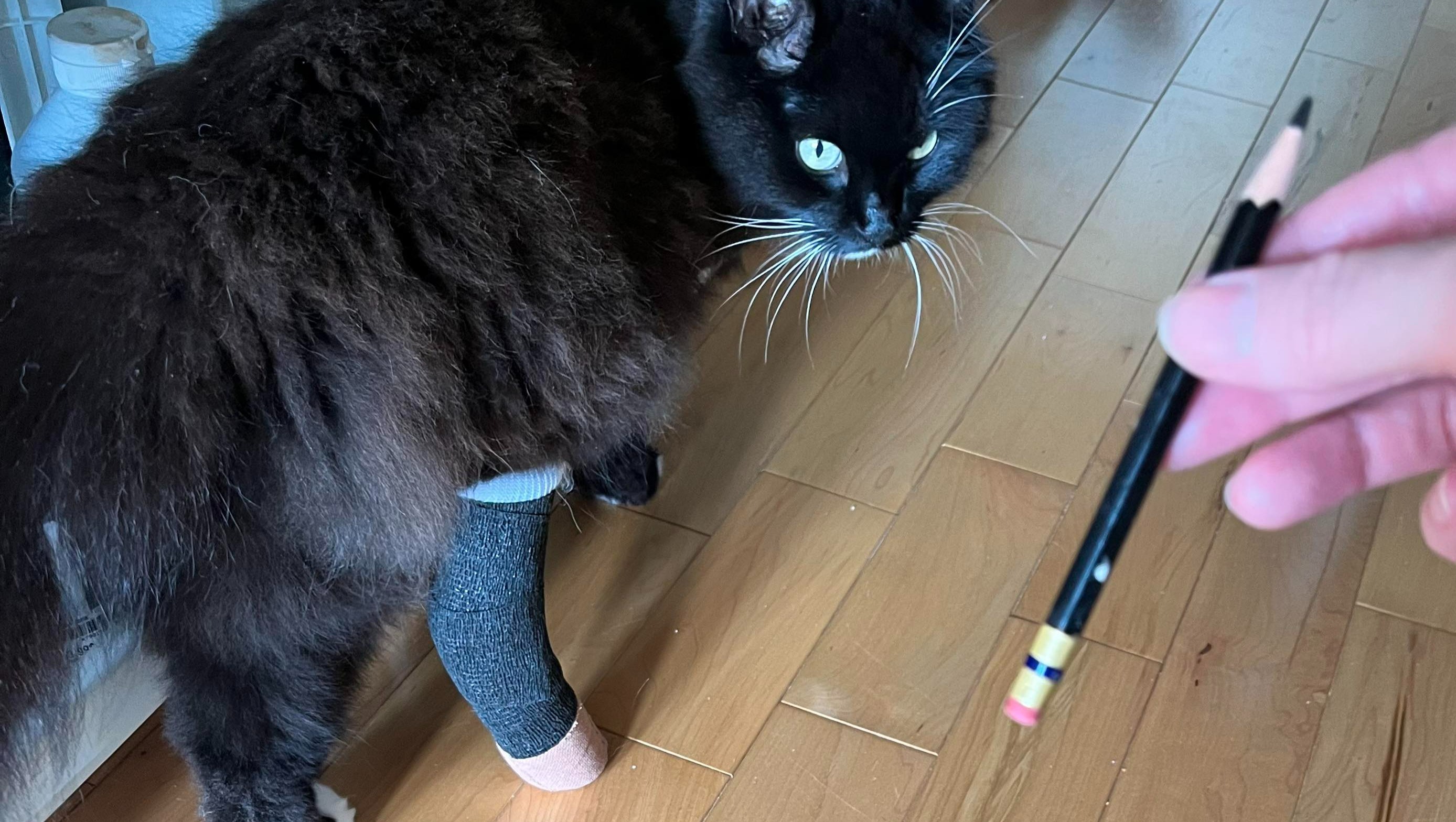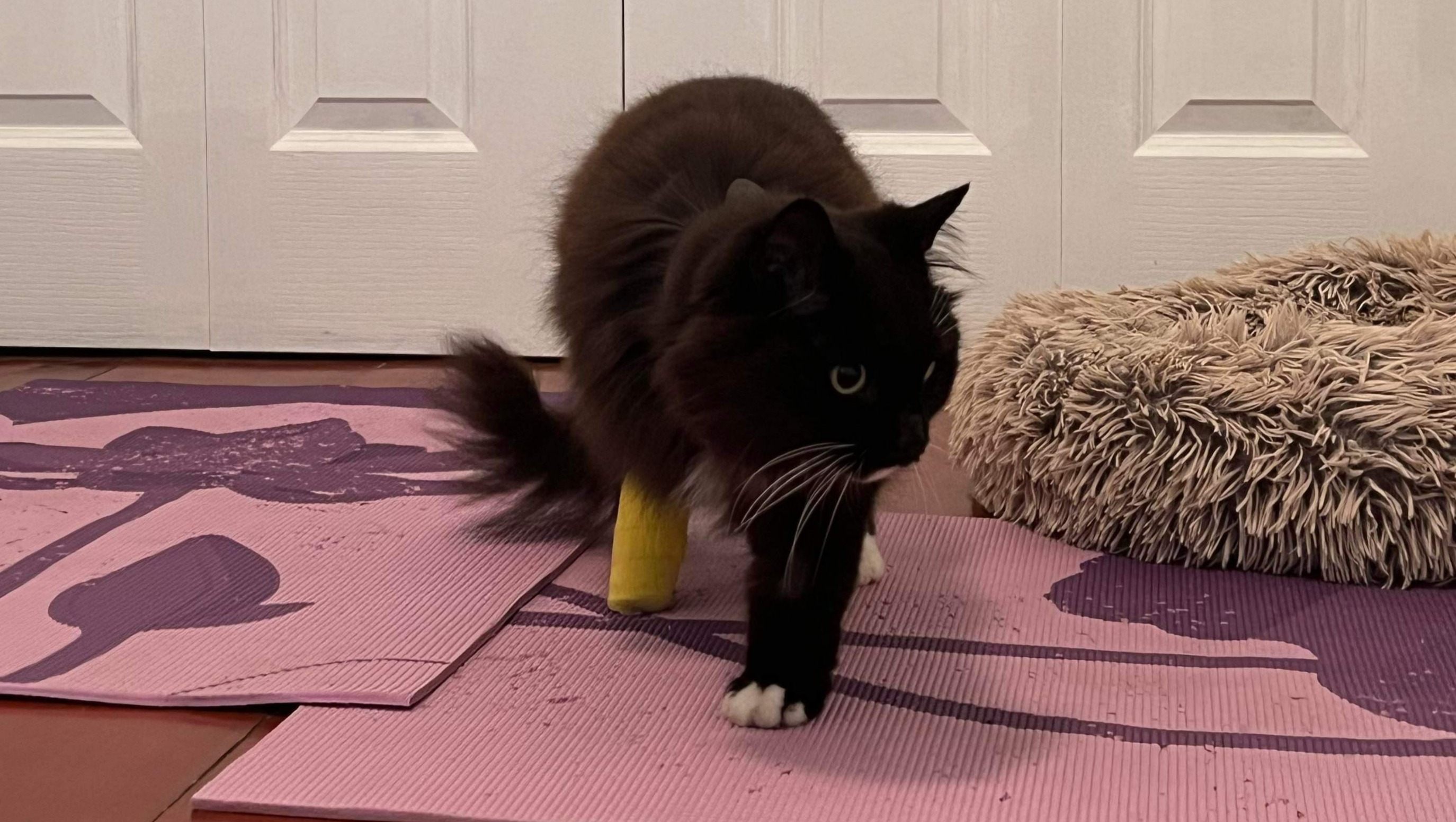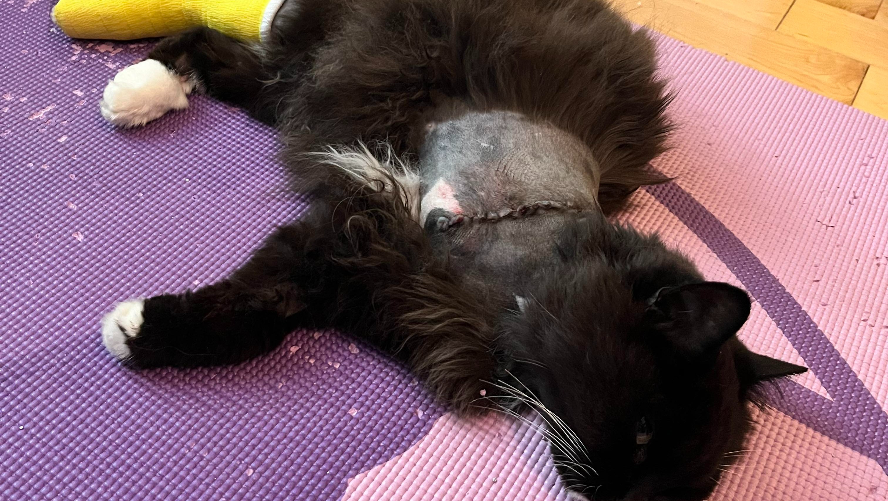 Elle fut de retour à la maison le lendemain, un peu destabilisée. Malgré tous les événements des jours précédents, sa "bonne humeur" n'a pas été affectée; elle a demandé la porte dès le jour 1 pour aller voir les voisins/amis, et elle a continué à feuler dans la direction de Tom et de Maze. Elle est beaucoup plus habile aujourd'hui sur ses 2 pattes et demi qu'il y a un mois, mais nous avons hâte de la voir sur ses trois pattes.