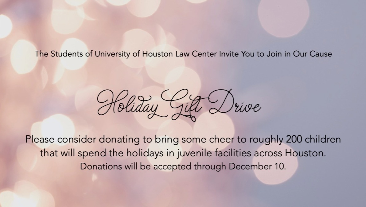 Over 150 children will spend this holiday season in juvenile facilities across Houston and away from their families. Students at the University of Houston Law Center are asking for your help to reach our goal of making their holidays a little brighter. Please consider donating so that we can purchase Christmas stockings that will be filled with toiletries, snacks, candy, books, journals, and crafts for the kids. We have partnered with the Juvenile Detention Center in Harris County, the Leadership Academy, and Youth Village. We appreciate your generosity!