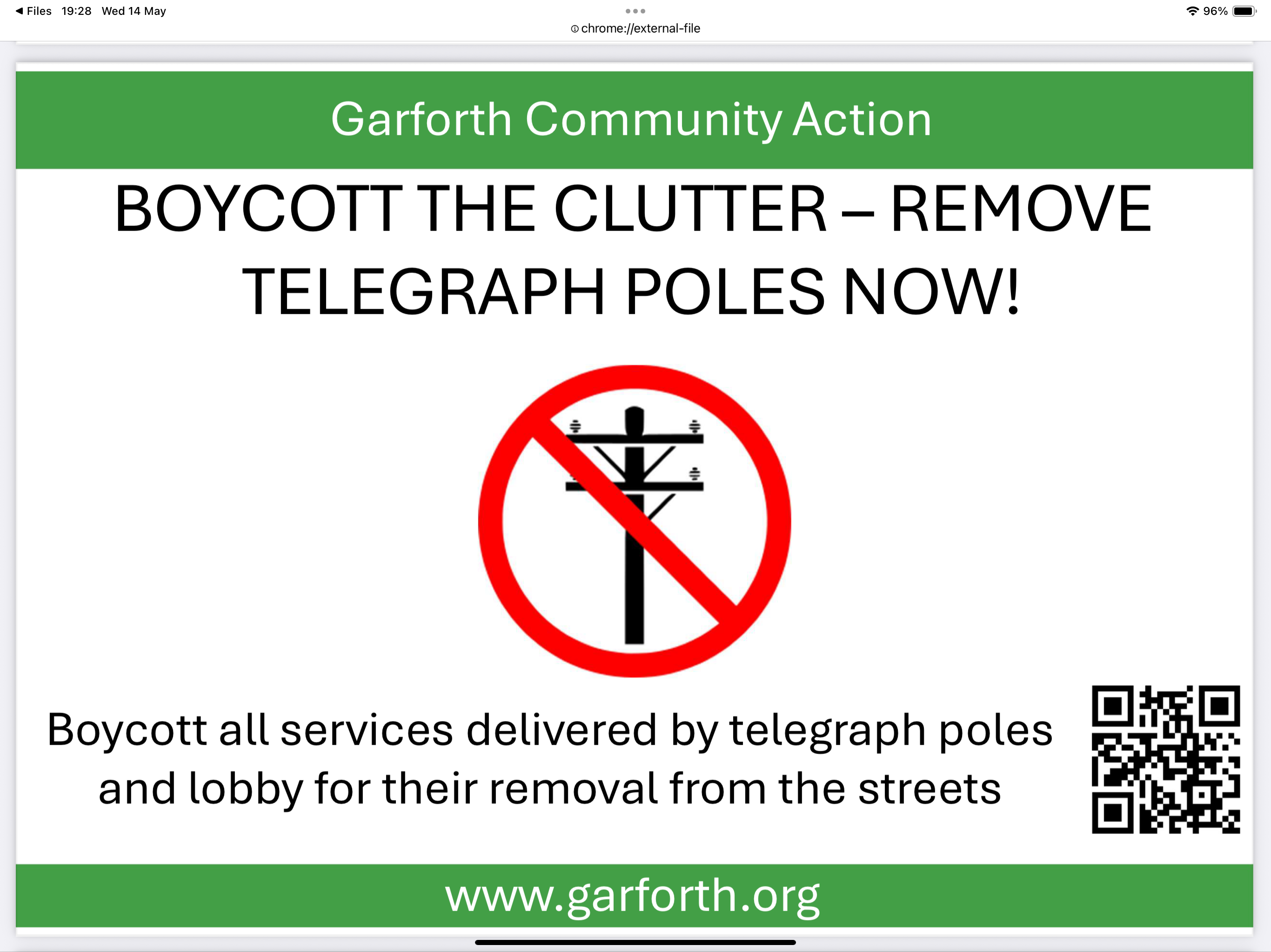 Hello everyone, we are members of the Garforth community in Leeds, West Yorkshire. We have been campaigning against the imposition of telegraph poles across Garforth since a company called SCD tried to install them in 2024. This year, a different company called GiggleFibre has now put up the telegraph poles all across Garforth, including those parts that have never had them. We think overhead cables are out-dated, unsightly, environmentally hazardous and just a way of making a quick profit for the company, with no regard to the community.