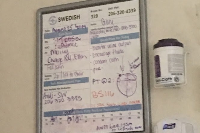 He spent a long time at Swedish.  About 20 days.  My mom was a rock star.  She advocated and pushed and hugged and cried. She barely rested that whole time. I went and saw them as much as I could. When her work was getting too far behind, she would have to leave Seattle and go home for a few days to get caught up then she would drive straight back to Seattle after work.