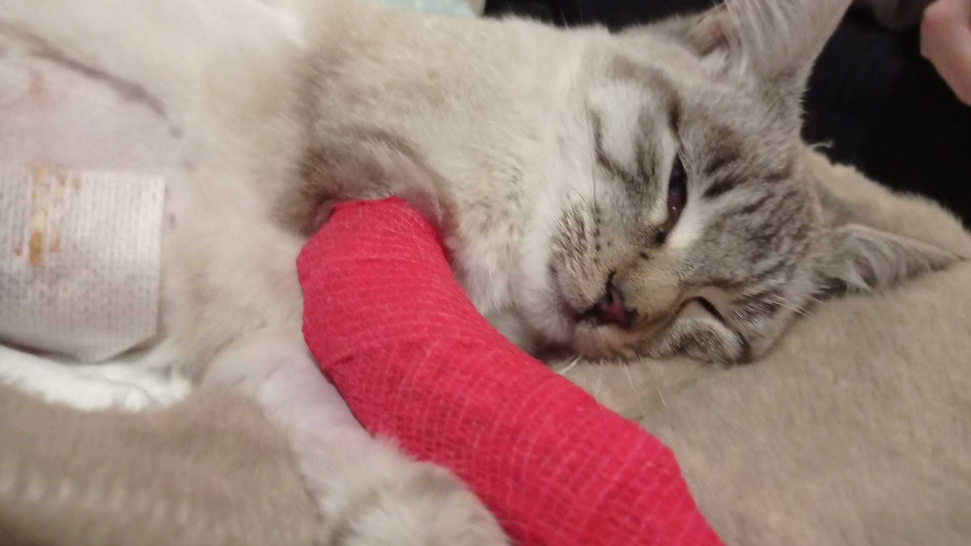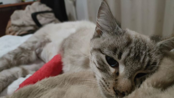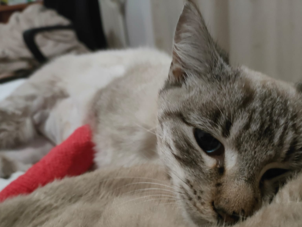 Hola, me llamo María y soy estudiante de veterinaria en León. Llevo alimentando desde hace un mes a este gatito callejero de unos 6 meses de edad, pero el viernes 17 de octubre me lo encontré entre unos arbustos inmóvil y con mucho dolor, donde creemos que se había ido a morir en paz. Le recogí para llevarlo a hacer pruebas y le vieron una fractura en el antebrazo, y varias hernias a nivel abdominal. La fractura ya está controlada pero las hernias no, además de que hay muchas posibilidades de que tenga una septicemia. La solución ahora mismo es quirúrgica y los gastos son inasumibles para una estudiante, pero si todos aportamos seguro que le salvamos la vida. Es un gato encantador, buenísimo y con muchísima suerte de seguir vivo gracias a todos vosotros, esperemos que pueda llevar una vida plena después de todo esto...