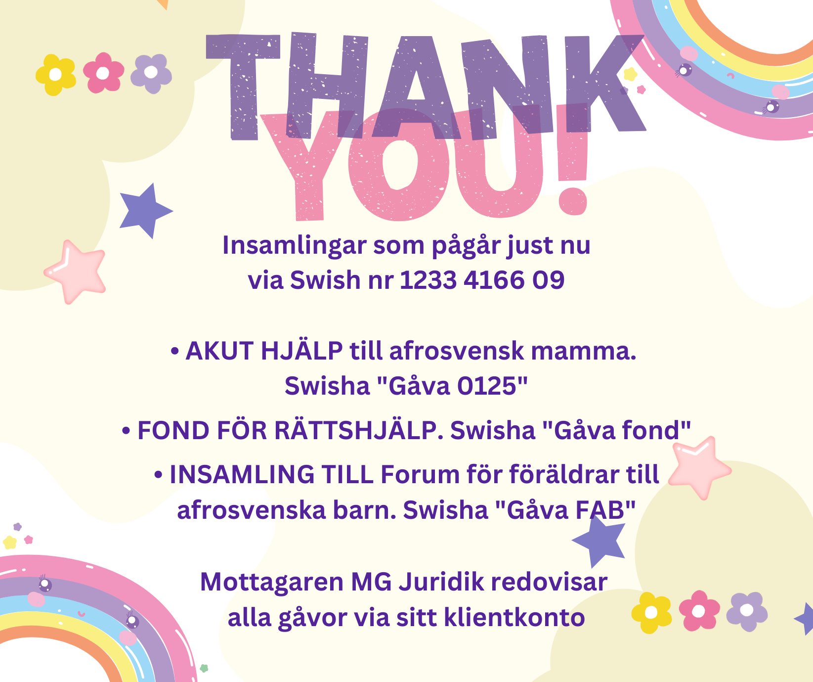 * MG Juridik tar emot Swish-gåvor via sitt klientkonto och skickar omgående (samma dag) vidare alla donationer till rätt mottagare. Swish-donationer redovisas därför här som "via MG Juridik".