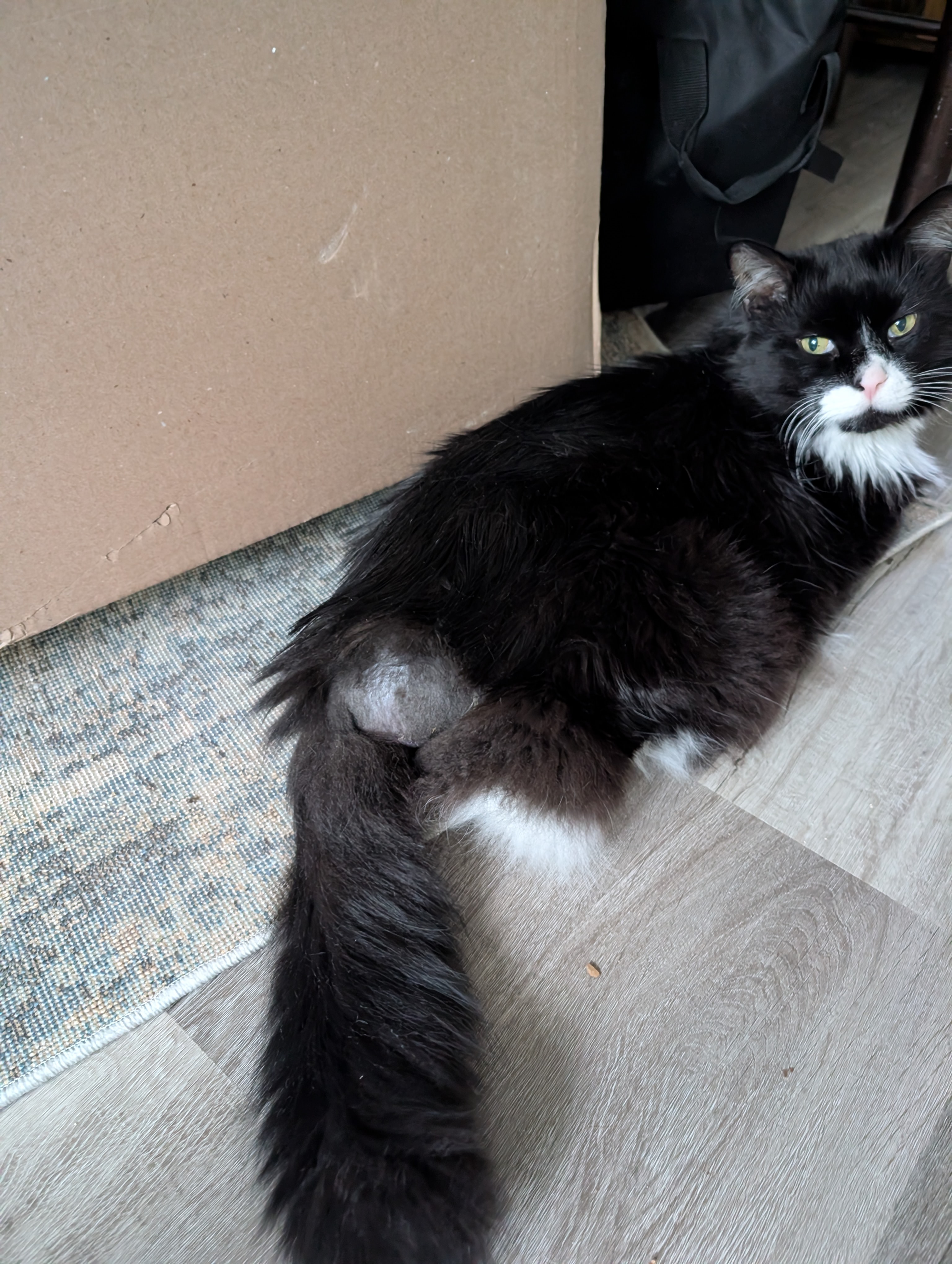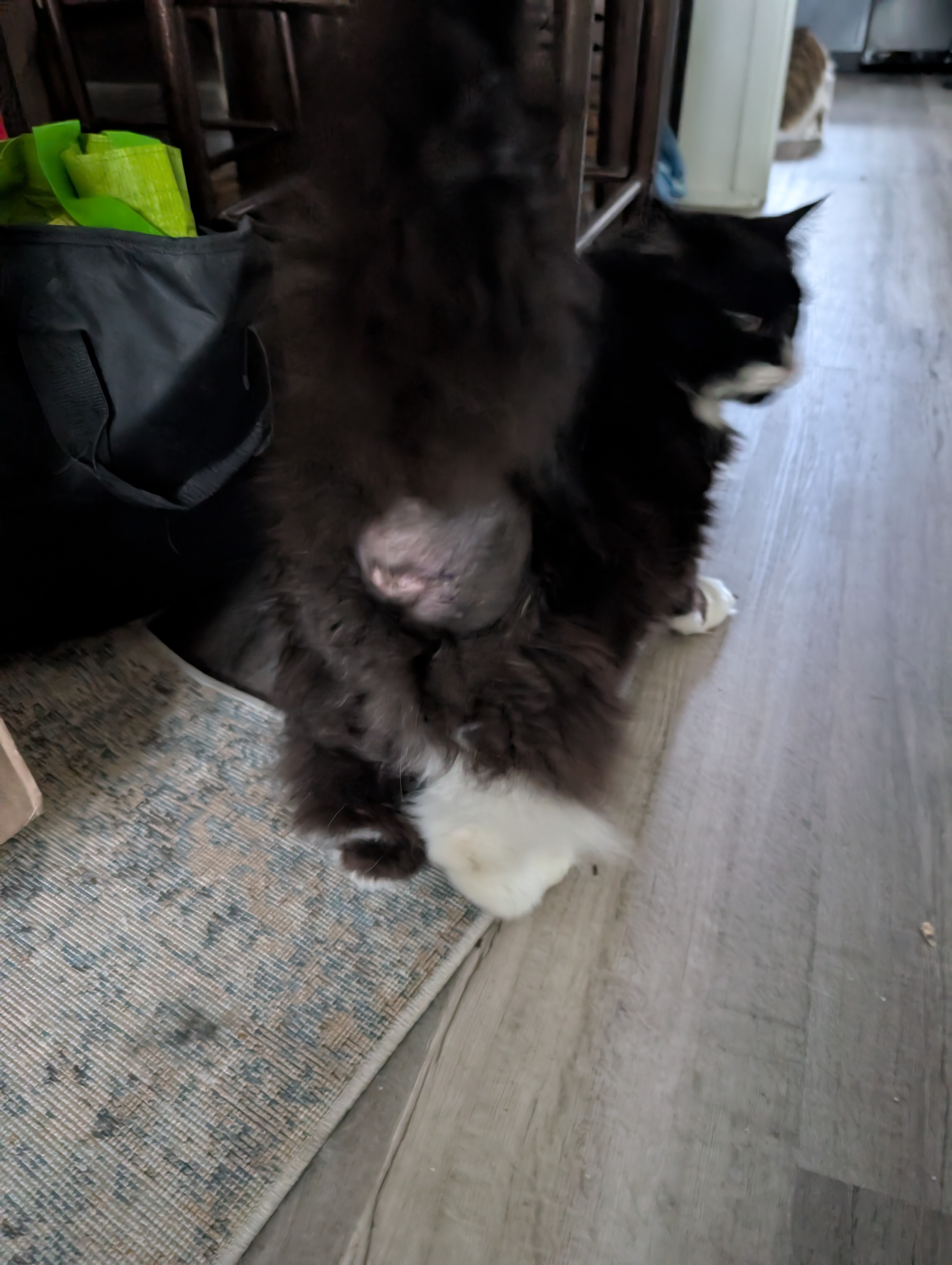 Recently, a large mass was discovered near Stitch’s anus. Initially, it was thought to be an anal gland abscess, but it never drained. A biopsy was inconclusive and showed abnormal lipoma-type tissue, raising concern that this may be something more serious. At this point, we don’t know if the mass is benign, a locally invasive cancer, or a malignant tumor—and that uncertainty makes it impossible to know how to help him without further testing.