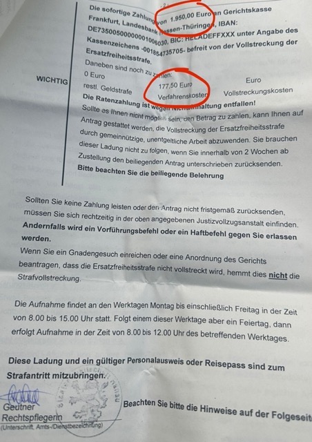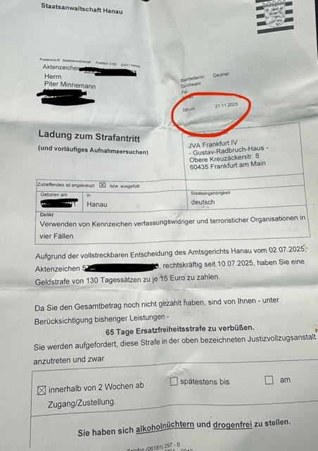 Wenn die Summe nicht beglichen wird, droht ihm bereits nächste Woche eine Ersatzfreiheitsstrafe von 65 Tagen.